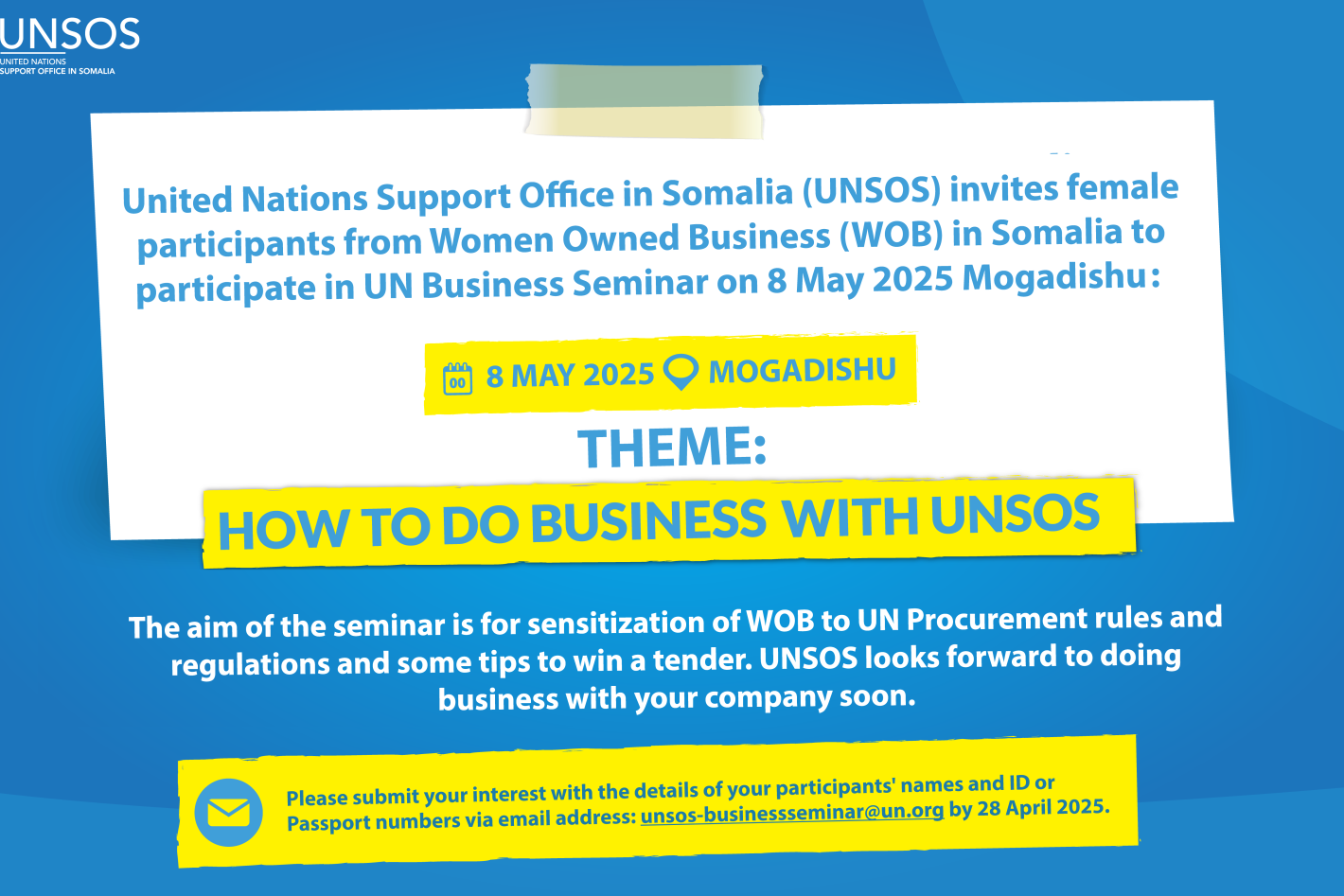 The United Nations Support Office in Somalia (UNSOS) invites female participants from Women Owned Business (WOB) in Somalia to participate in the UN Business Seminar on 8 May 2025 in Mogadishu: THEME: HOW TO DO BUSINESS WITH…