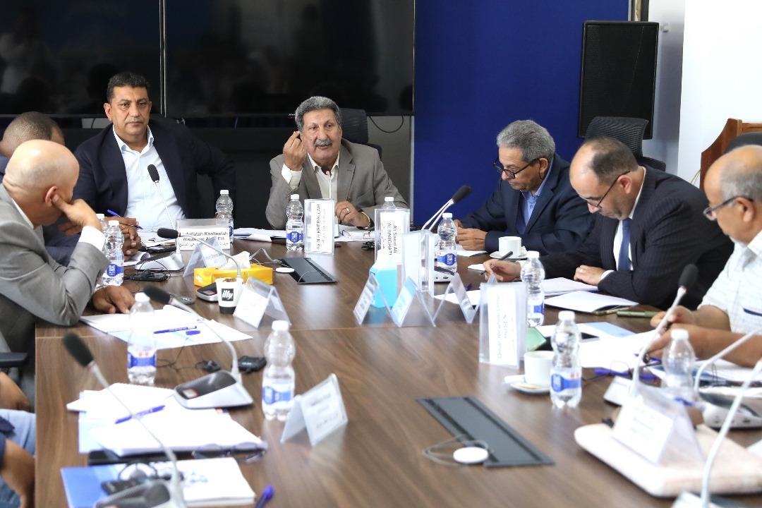 Several people seated at a table indoors during a meeting, with notebooks, papers, and water bottles spread across the table.