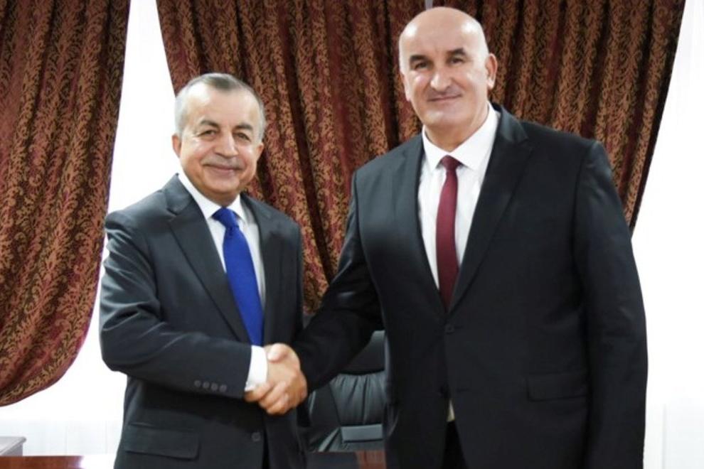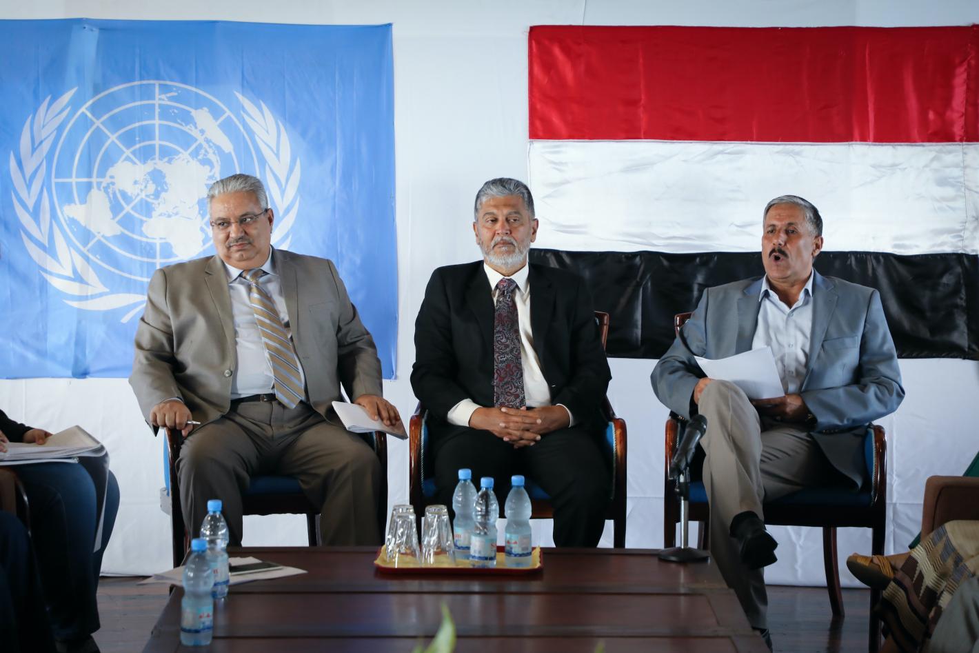 RCC Co-chairs General Mohammed Eidah (left) and General Ali Al Mushiki (right) with UNMHA Head of Mission Abhijit Guha (centre) during the seventh RCC joint meeting. UN Photo/UNMHA.
