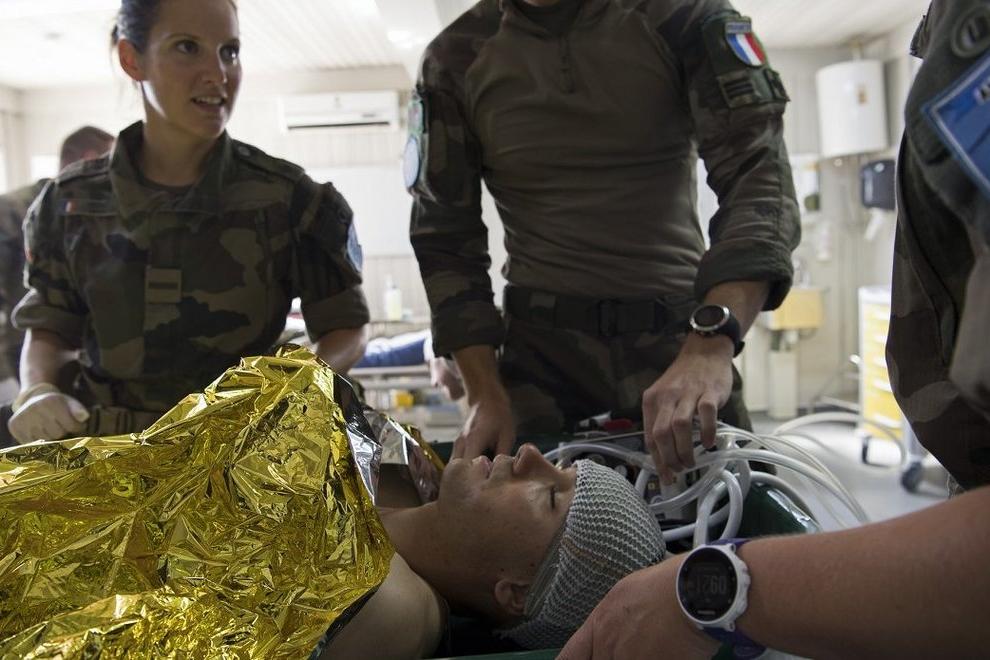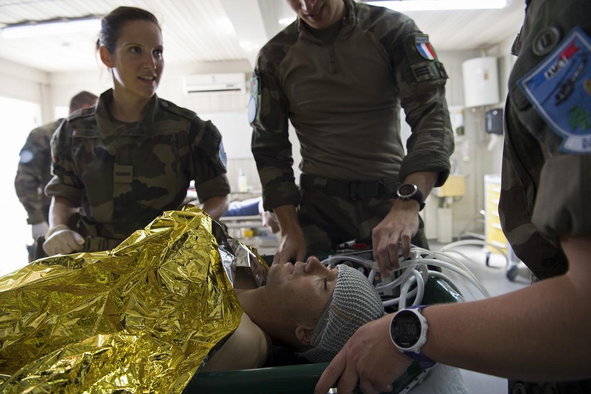 UNIFIL French peacekeepers with medical capabilities monitor their substitute patient. Several injured patients, two on stretchers, were rushed to a waiting helicopter. This was part of a real-life scenario and a dramatic air…