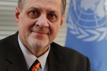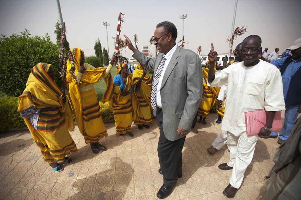Deputy UNAMID JSR, Mohamed Yonis, and the chairman of the AU delegation, Ambassador Bulus Paul Zom Lolo of Nigeria, at El Fasher airport. Photo by Albert González Farran