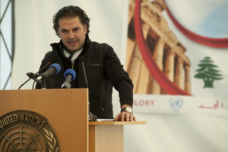 UN ambassador for climate change and artist Ragheb Alama addressing the crowd of UNIFIL staff members and peacekeepers during the Independence ceremony held at UNIFIL headquarters, Naqoura