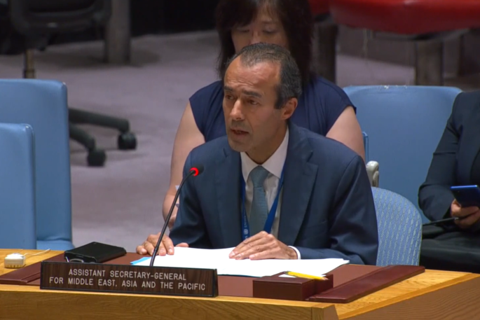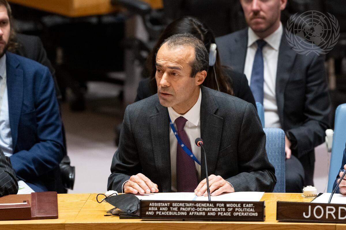 Khaled Khiari, Assistant Secretary-General for Middle East, Asia and the Pacific in the Departments of Political and Peacebuilding Affairs and Peace Operations, briefs the Security Council meeting on the situation in the Middle East, including the Palestinian question. (UN Photo/ Eskinder Debebe - 5 January 2023)