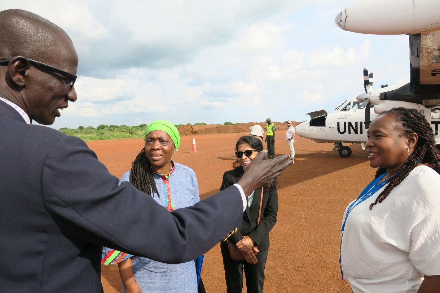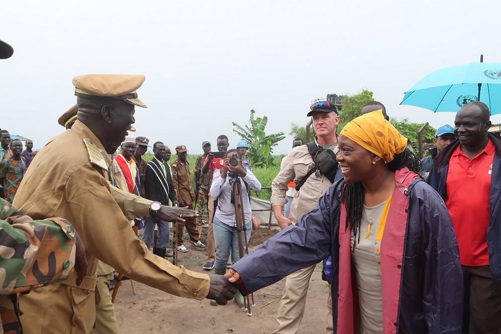 On a day-long visit to Canal in Pigi county, UNMISS Deputy Special Representative for South Sudan and Resident & Humanitarian Coordinator Sara Beysolow Nyanti met with community members, listened to their concerns, and most importantly received their heartfelt appreciation for recent demining efforts by UNMAS here. UNMAS cleared 25 anti-personnel mines from this remote area, making the ground safe for displaced as well as host populations. Photo by Ines Surwumwe/UNMISS