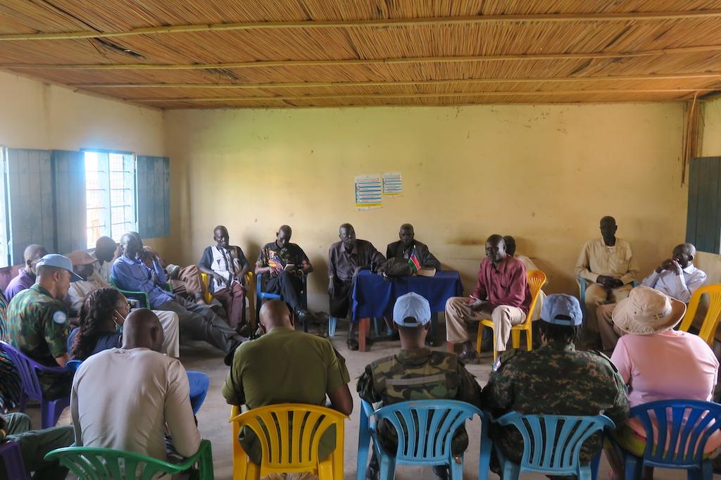 An UNMISS team in a meeting to discuss how to reduce tensions between feuding communities in Magwi County. Photos: Moses Yakudu/UNMISS