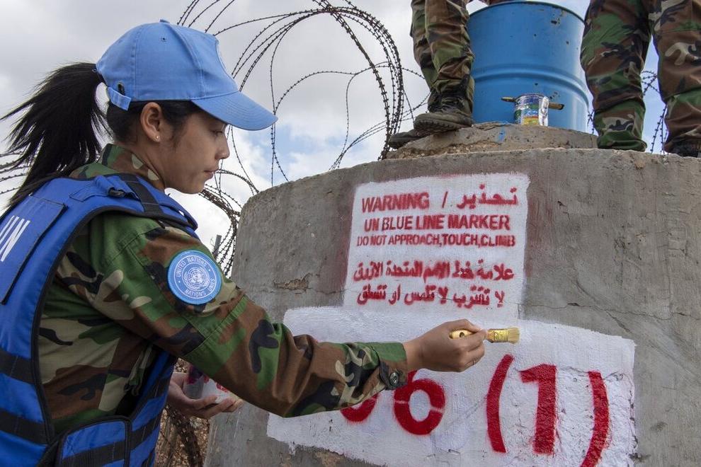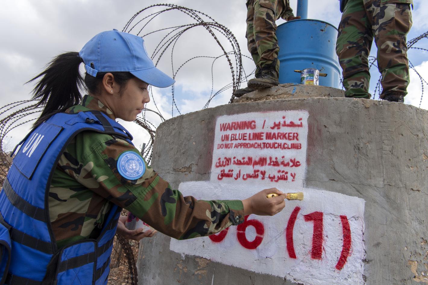 Cambodian peacekeepers give finishing touches to a blue barrel along the Blue Line south of the Lebanese village of Yaroun on 02 November 2021. (UN Photo / Pasqual Gorriz)