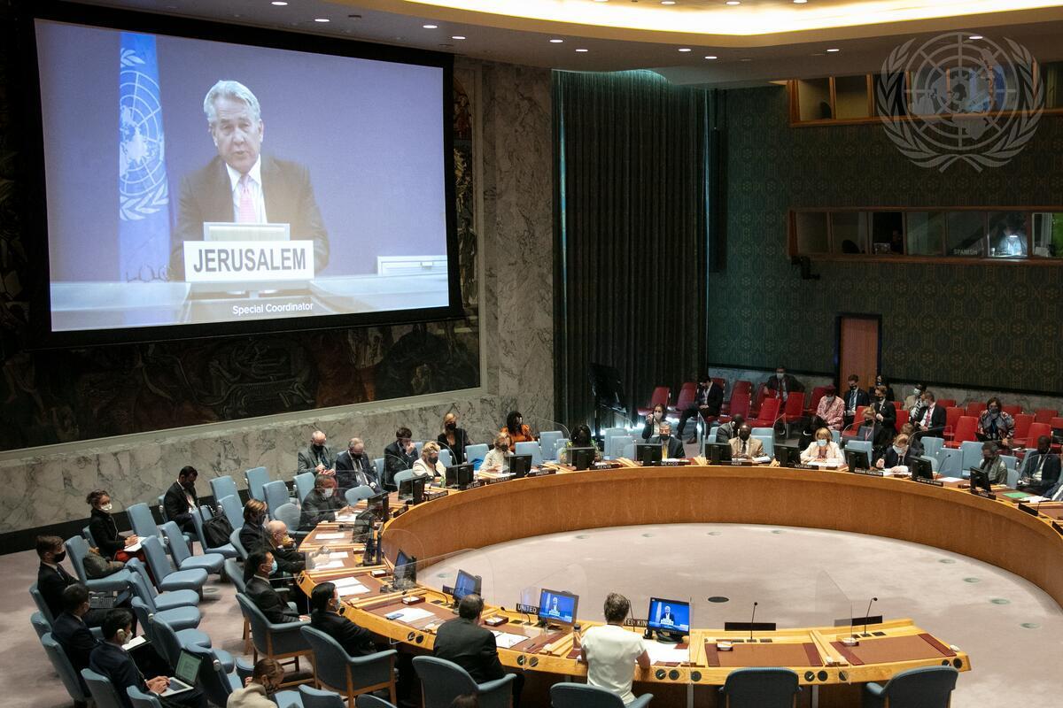 Tor Wennesland (on screen), Special Coordinator for the Middle East Peace Process, briefs the Security Council meeting on the situation in the Middle East, including the Palestinian Question (UN Photo UN Photo/Ariana Lindquist - 29/09/2021)