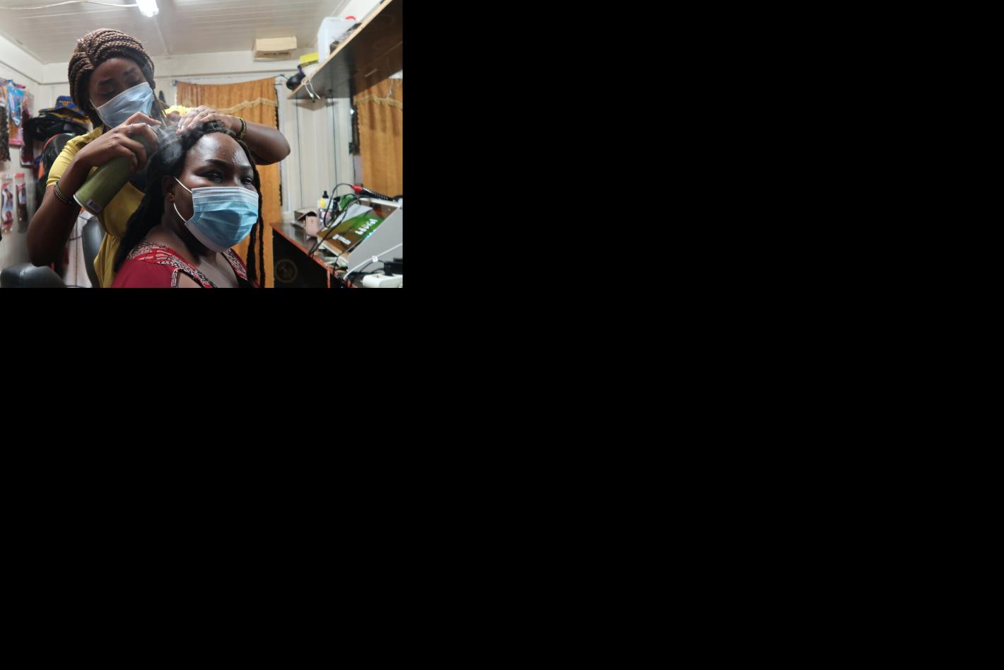 Ana James, 24, and Sunday Chol, 23, are sought-after hairdressers in Malakal, South Sudan. Both have no formal training in the beauty industry, but are passionate about entrepreneurship and fashion. Photo by Samson Liberty/UNMISS.