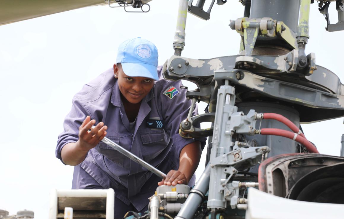 La casquette vissée sur le crâne laisse entrevoir le cheveu ras, l’œil pétillant et un sourire franc. La salopette grise qu’elle porte s’avère être son costume quotidien. Sa fonction ? Mécanicienne pour hélicoptère Oryx au sein de l’Unité composite d’hélicoptères de la MONUSCO, à l’aéroport de Goma, en République démocratique du Congo. Cette unité qui compte 155 militaires dont une soixantaine de femmes, est sous le commandement d’une autre femme, le lieutenant-colonel Liliane Niemack.