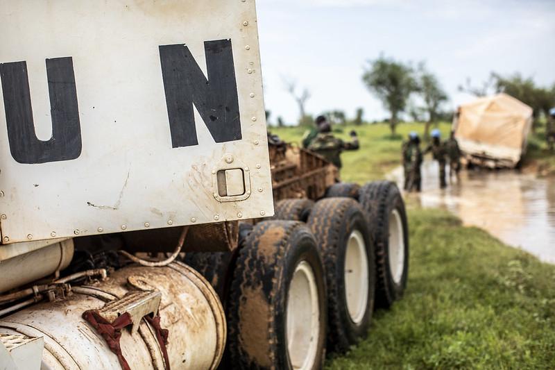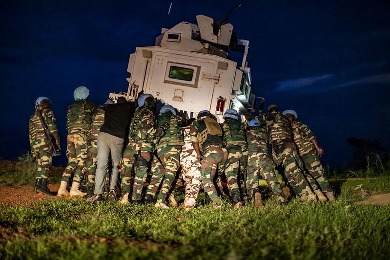 Le ciel qui était chargé il y a quelques minutes, tient désormais ses promesses. D’un coup des trombes d’eau s’abattent, un premier véhicule blindé lourd s’embourbe. Prévenus par radio, les véhicules de tête s’arrêtent. Le dispositif qui a servi pour sécuriser la détection d’explosifs se met à nouveau en branle. Munis de pelles et de pioches les Casques bleus raclent la boue et l’eau sous les roues du blindé. Il est plus de 20h et les neuf kilomètres qui les séparent de la base d’Ogossagou viennent à peine d’être entrepris. La nuit s’annonce longue.