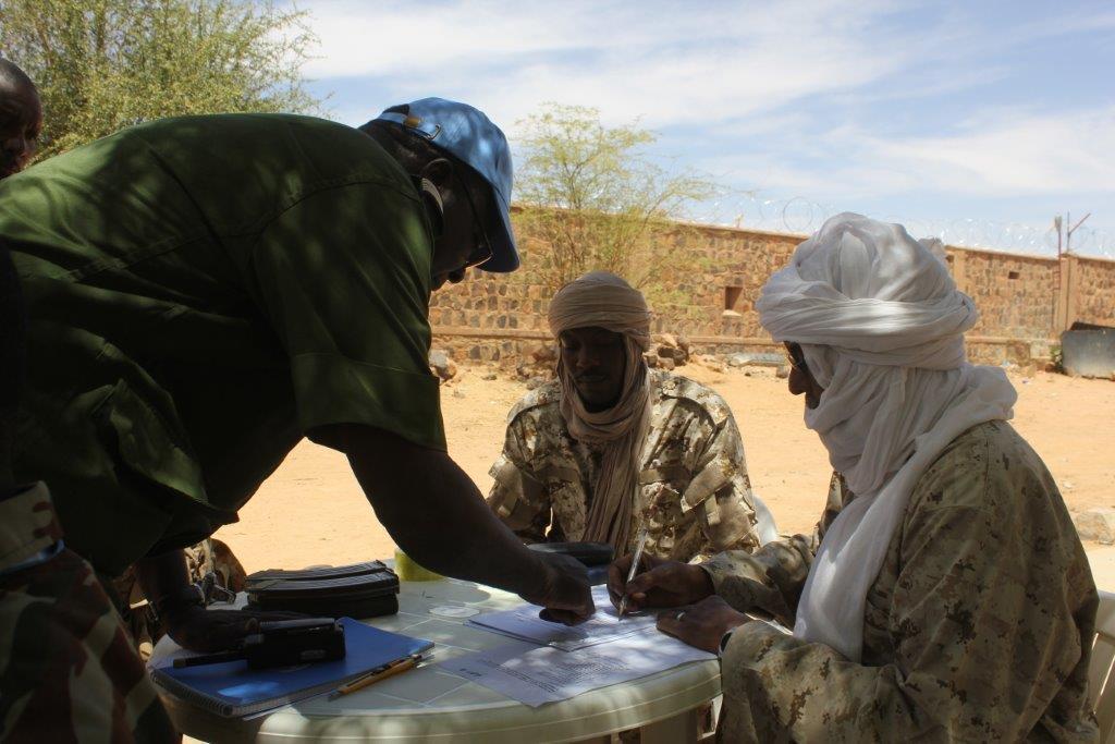Plus spécifiquement, le processus d’enregistrement consiste : « … à rassembler l’ensemble des trois groupes… Une fois que cela est fait, on leur donne quelques consignes de sécurité pour éviter d’avoir des incidents avec l’armement et la manipulation des munitions. Une fois que ces consignes sont données on appelle les combattants, un de chaque groupe et donc, par trinôme ils se dirigent sur un premier stand d’enregistrement de l’armement, afin que chaque combattant ait une arme identifiée et le numéro de série relevé, » a expliqué le Lieutenant-Colonel Robineau, Chef du Secteur Nord de la Force de la MINUSMA. Après ce premier contrôle, les combattants sont ensuite dirigés vers des ateliers animés par la division des droits de l’homme et de la protection de la MINUSMA. « Ceci, afin de vérifier que la personne n’ait pas commis de crime ou que son casier lui permette effectivement d’intégrer l’armée malienne, » poursuit le Chef du Secteur Nord de la Mission des Nations Unies. Ce processus se termine par un enregistrement biométrique de chaque combattant, avec à la clef, l’établissement d’une carte d’identité, pour entre autres, éviter les infiltrations d’éléments étrangers.