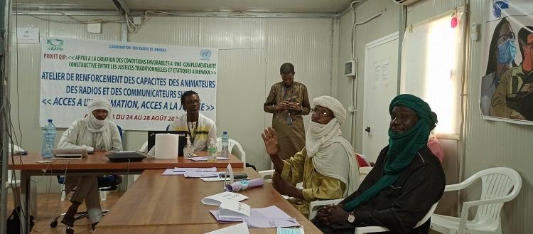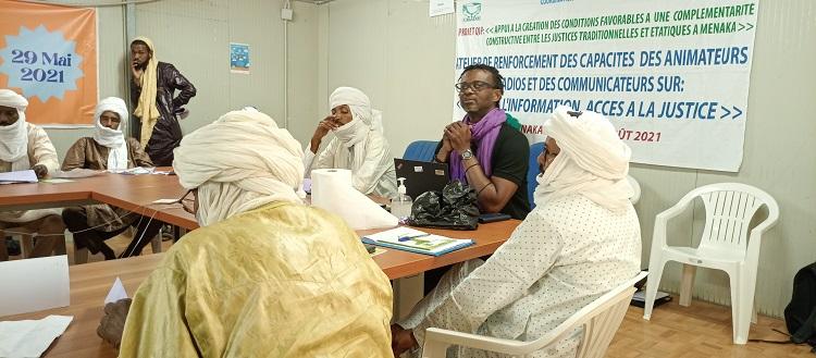 Ces journées de renforcement des capacités animateurs et communicateurs autour du thème « Accès à l’information, accès à la justice », ont été initiées par le Cabinet de Recherche Actions pour le Développement Endogène (CRADE) en collaboration avec la Coordination des radios de la région de Ménaka et la MINUSMA. Les échanges ont été facilités par la Section des Affaires Judiciaires et Pénitentiaires, la radio des Nations unies, Mikado FM et le Bureau de la Communication de la MINUSMA, la greffière de la Justice de paix à compétence étendue de Ménaka, un expert national de la Police et le maire de Ménaka.