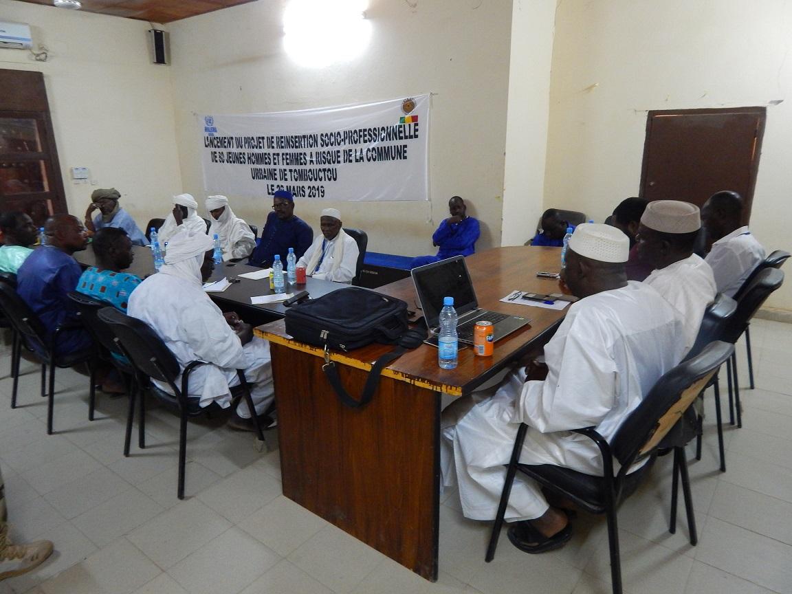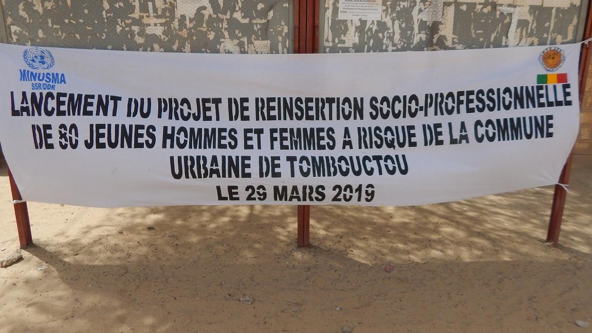 La Mairie de Tombouctou a abrité, le 29 mars dernier, le lancement officiel d’un Projet d’Appui à la Réduction de la Violence Communautaire (RVC) et à la consolidation de la paix, à travers la formation et l’insertion socioprofessionnelle de 80 jeunes de la commune urbaine de Tombouctou. Ce projet vise à accompagner la formation et l’installation de 80 jeunes dans huit filières de formation : coupe et couture, maroquinerie, boulangeries, pâtisseries, menuiserie bois et métalliques, réparation motos et autos, réparation photovoltaïque et pompe immergée. Il est financé par la MINUSMA à travers sa Section de la Réforme du Secteur de la Sécurité et du Désarmement, de la Démobilisation et la Réinsertion (RSS-DDR), pour plus de 50 millions de FCFA.