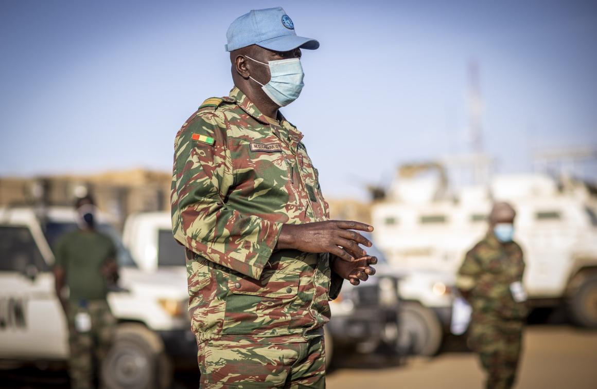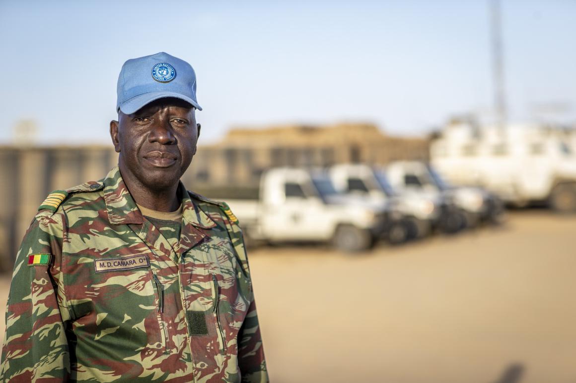 Arrivé à Kidal au mois d’octobre 2020, le Colonel CAMARA Mamadou Diouldé qui dirige le 6ème bataillon des Casques bleu guinéen au Mali (GANGAN 6) n’en est pas à sa première mission dans une Opération de paix des Nations Unies. En effet, il a déjà servi en 2002 en Sierra Leone, puis au Sahara Occidental. Le Mali est donc le troisième pays dans lequel le colonel Camara Mamadou Diouldé se met au service de la paix sous la bannière de l’ONU. « Le Mali est frontalier de la Guinée et il y a les mêmes populations qui vivent de chaque côté de la frontière. J’éprouve un sentiment de fierté en contribuant à y ramener la paix » explique fièrement celui qui dirige les 650 soldats guinéens déployés à Kidal.