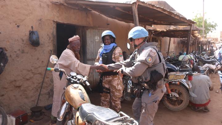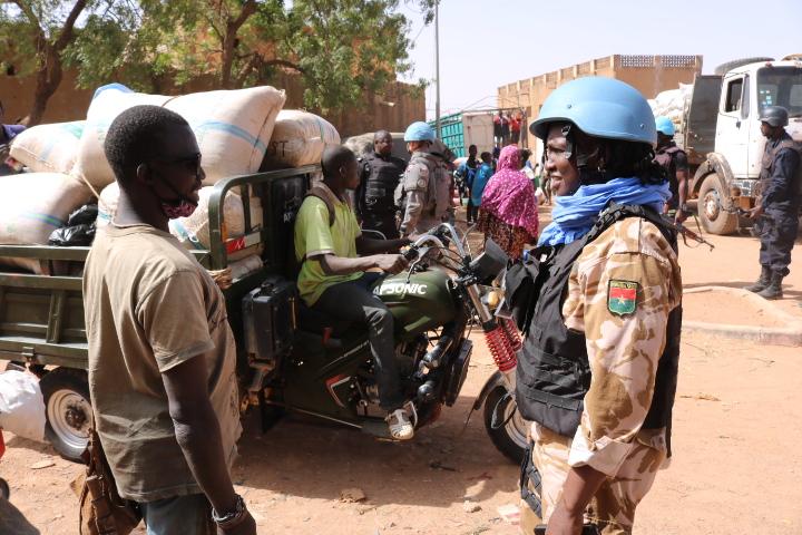 Les Casques bleus de la MINUSMA font une patrouille pédestre dans la foire de Bandiagara