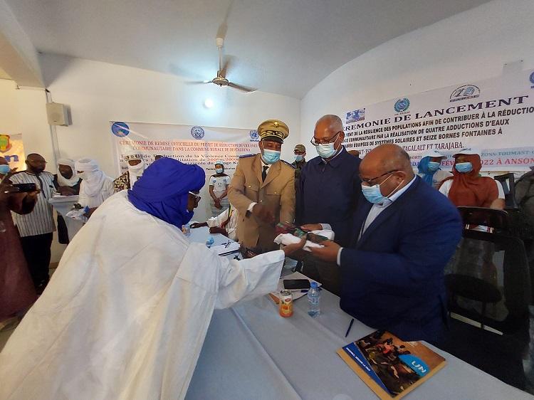 El-Ghassim WANE a également mis sa visite à profit pour lancer sept nouveaux projets pour le cercle d’Ansongo d’un montant global de plus d’un milliard de francs CFA qui bénéficieront directement à 75 130 membres des communautés dont 40 018 femmes. Quatre de ces projets en cours d’exécution sont financés par le Fonds Fiduciaire des Nations Unies pour la Paix et la Sécurité au Mali, financés grâce aux contributions de l’Allemagne et du Royaume-Uni et deux projets de réduction des violences communautaires qui seront exécutés à Ansongo ville et six autres localités dans les communes de Bara, Ouattagouna et Tessit : La construction de quatre Checks points à Ansongo ; la réhabilitation du camp des FAMa à Ansongo, l’appui à l’assainissement de la ville d’Ansongo, le projet d’assainissement Ansongo (volet lutte contre les inondations) ; la construction de quatre adductions d’eau sommaires équipées de systèmes solaires et 16 bornes-fontaines à Tessit-Est, Tessit-Ouest, Tagalalt et Tarajaba ; l’amélioration des conditions de production agro-aviaire et la création de 1545 emplois à Tinassame, Bentia et Bara dans les cercles de Gao et Ansongo, dans le cadre de la réduction de la violence communautaire. « En acceptant de prendre personnellement part à cette cérémonie, je voudrais vous exprimer toute l’attention que j’accorde à cette immense contribution de valeur destinée à rendre vivable une circonscription en proie à l’insécurité depuis une décennie. En mettant à notre disposition des projets et ouvrages de résilience d’une valeur inestimable à nos yeux, vous avez encore illustré l’exemplarité et la solidité de la chaine de coopération entre le Gouvernement de la République du Mali et le système des Nations Unies. Ces actions de haute portée, en plus de contribuer à l’amélioration des conditions de vie de nos populations et au renforcement des capacités et la performance de nos agents, s’inscrivent de la pérennisation de vos multiples interventions en faveur de la stabilisation et du relèvement du cercle d’Ansongo sérieusement affecté par la crise sécuritaire, » s’est réjoui Mohamed Ag AKLINI, Préfet du Cercle d’Ansongo.