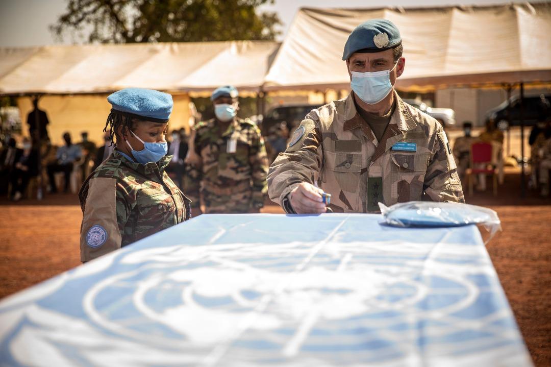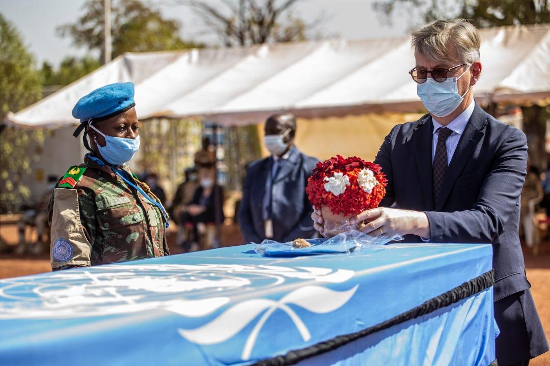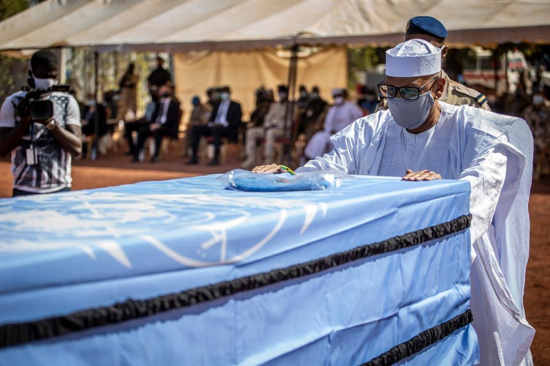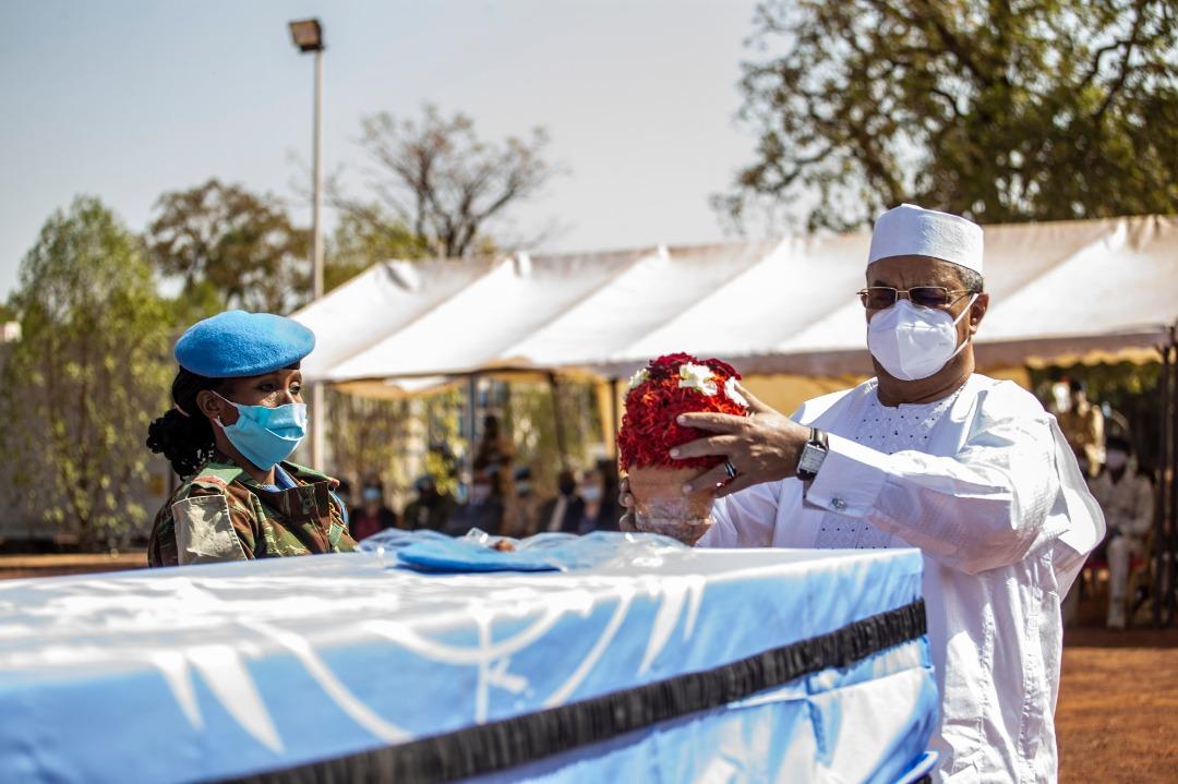 En début d’après-midi, ce 19 janvier, Jean-Pierre LACROIX, Mahamat Saleh ANNADIF et le Commandant des Casques bleus, le Général Dennis GYLLENSPORRE, accompagnés des Ministres maliens de la Réconciliation nationale, le Colonel Major Ismaël WAGUE et Zeïni MOULAYE des Affaires étrangères, des Ambassadeurs de la Côte d’Ivoire et du Royaume-Uni au Mali, ainsi que des officiers supérieurs des Forces armées ivoiriennes et maliennes, ont rendu hommage aux quatre Casques bleus ivoiriens, décédés à Tombouctou au service de la paix au Mali. C’était au monument aux morts du Quartier général de la MINUSMA, en présence d’officiels civils et en uniforme de la Mission de paix de l’ONU au Mali, en nombre restreint afin de respecter les mesures de prévention contre la Covid-19.