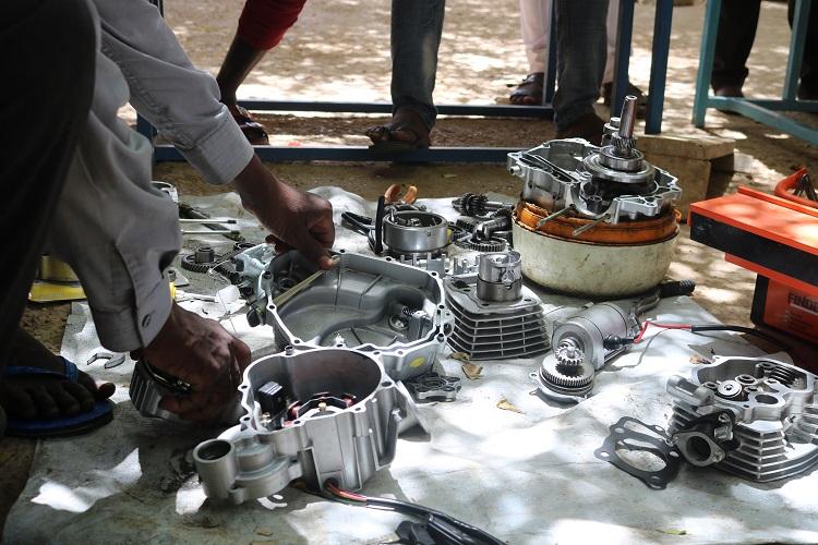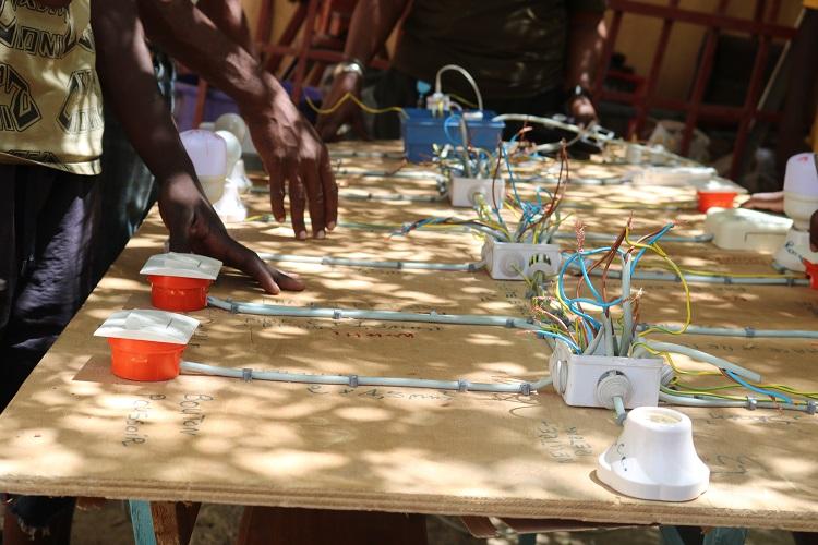 Housseni YACOUBA, le professeur d’électricité donne ses instructions aux deux premiers groupes. Exercice : « Aujourd’hui, vous installerez le système électrique du studio de la radio Mikado FM (la radio des Nations unies au Mali) en vous basant sur le schéma architectural dessiné ici au tableau ». Pendant ce temps, les participants à l’atelier mécanique reçoivent eux aussi les consignes de leur formateur. Leur exercice à eux consiste à monter le moteur d’une moto tricycle entièrement démonté et le redémarrer.