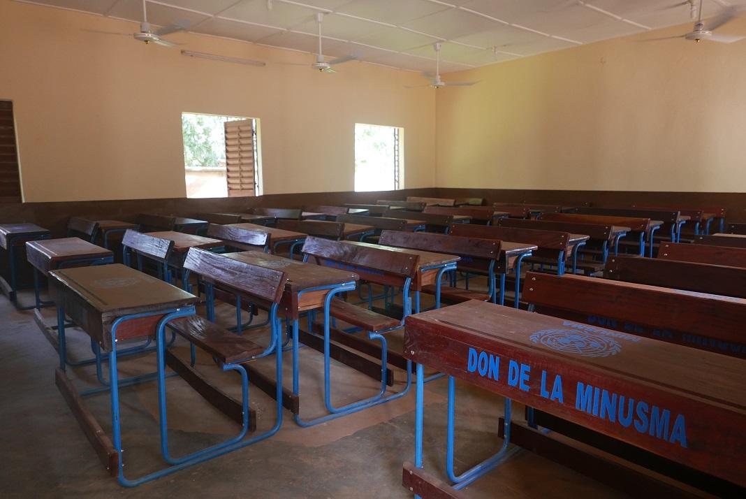 Initié par la section de la Protection des Enfants de la Mission onusienne au Mali, ce projet à impact rapide va permettre d’équiper et de réhabiliter 10 salles de classes dont la plupart étaient dans un état de délabrement avancé (peintures, sols, plafonds, portes, murs, et installations électriques). Avant cette contribution de la MINUSMA, certaines classes devaient arrêter les cours dès qu’il pleuvait car les toits fuyaient. Jusque-là, seuls 256 tables-bancs étaient disponibles. Chacun d’entre eux pouvaient supporter jusqu’à sept enfants en même temps. Sinon, c’est à même le sol que beaucoup suivaient les cours, comme en témoigne la représentante des élèves. « S’assoir par terre n’est plus qu’un mauvais souvenir, » a déclaré celle-ci avant de poursuivre : « la MINUSMA a fait sa part maintenant, la balle est dans le camp des enfants. » Avant de céder la parole, la jeune fille a plaidé pour la mise à disposition d’une bibliothèque, d’une salle informatique et d’un forage pour l’assainissement.
