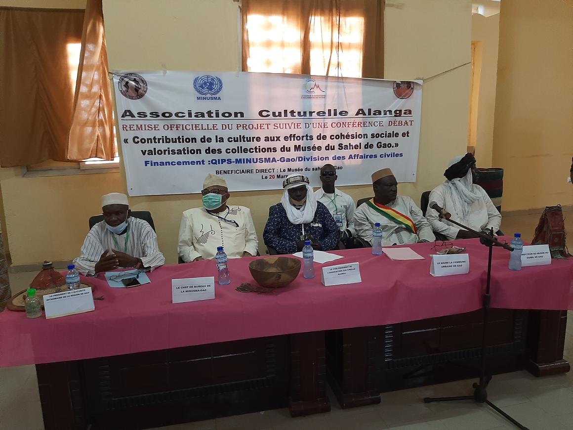 Le 20 mars dernier a eu lieu à Gao, la cérémonie de remise officielle du projet intitulé « Contribution de la culture aux efforts de cohésion sociale et la valorisation des collections du Musée du Sahel de Gao » par le Chef du Bureau régional de la MINUSMA. Ce projet s’inscrit dans le cadre du Mandat de la MINUSMA qui lui enjoint de contribuer à l’accompagnement des initiatives locales liées à la promotion de la paix, de la cohésion sociale et du vivre ensemble.