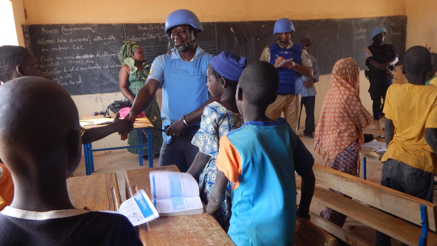 Les gardiens de la paix de la MINUSMA rendent visite aux enseignants et élèves de l’école primaire Gougoumali, dans le village de Kadji. L’école a un effectif de 183 élèves, dont 78 filles. « Bien que le pourcentage des enfants fréquentant l’école soit relativement élevé, mais seul un petit nombre d’entre eux termine leur éducation primaire » admet Mme Ize Boncana, enseignante en 4ème année. « Beaucoup d’enfants marchent plus de 5 kilomètres chaque jour pour venir suivre les cours! La cantine scolaire peut aider à garder les enfants jusqu’à la fin de leur cycle primaire » a-t-elle affirmé.