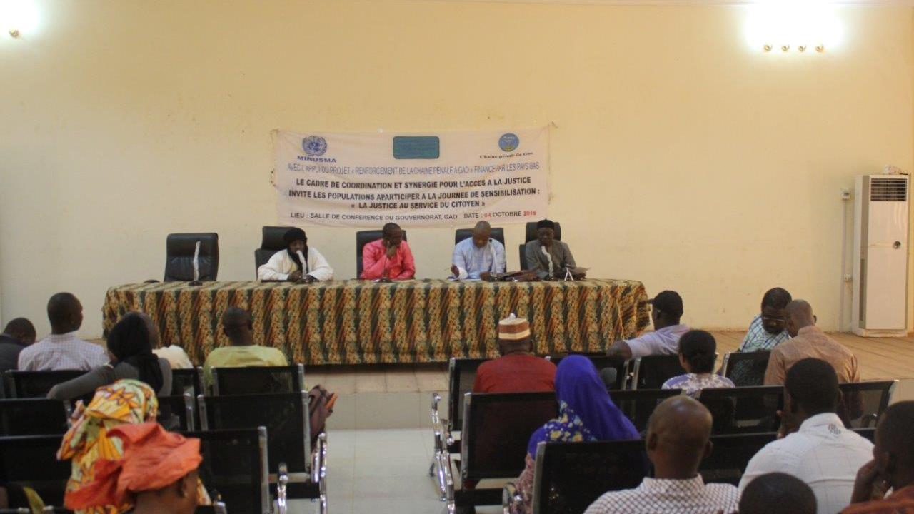 Le Programme d’Urgence pour le Renforcement du Système Judiciaire et la Mise en Œuvre de l'Accord pour la paix et la réconciliation, lancé par le gouvernement malien, en décembre 2015, accorde une place importante à la sensibilisation dans le but de faciliter l’accès à la justice. « Le but principal de ces discussions est de donner une meilleure visibilité, lisibilité et connaissance de la justice et de créer les conditions nécessaires pour susciter la confiance des citoyens en la justice. Également, faire connaître, comprendre et renforcer le soutien populaire à la mise en œuvre de l’Accord, particulièrement dans sa dimension justice et droits humains », a expliqué M. Tiecoura Ferdinand Konaté, Président par intérim du Tribunal de Grande Instance de Gao.