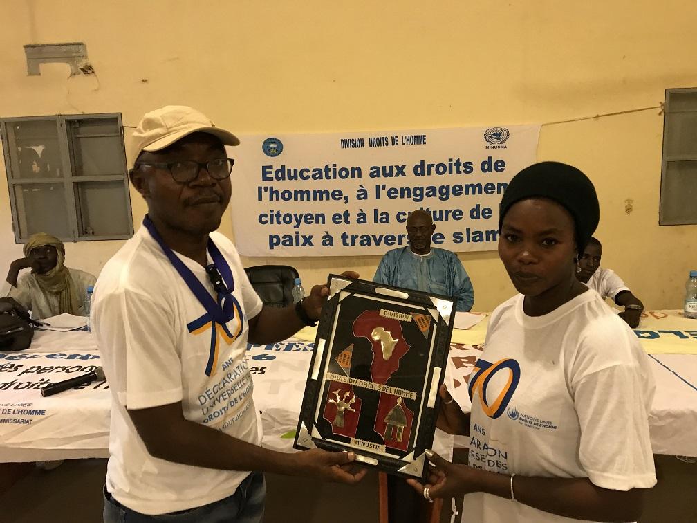 La compétition qui était prévue dans le programme a enregistré 11 slameurs, dont 4 jeunes filles. Chaque candidat a choisi un thème lié à celui de l’atelier pour sa prestation. De la scolarisation de la jeune fille, à la dénonciation des violences faites aux femmes en passant par le banditisme et l’injustice, les slameurs ont démontré leur engament à travers des mots qui sensibilisent et rappellent la nécessité du respect de certaines valeurs pour assurer la paix et le vivre ensemble durable. « C’est un sentiment de fierté qui m’anime aujourd’hui quand je vois ces jeunes artistes s’intéressés aux questions relatives aux droits de l’homme et à la citoyenneté. Très souvent ils racontent qu’ils connaissent leurs droits mais c’est le contraire dans la pratique. Cette initiative est vraiment salutaire et nous en remercions la MINUSMA qui ne cesse mener des actions dans le sens de la construction d’une paix durable, » s’est réjoui M. Abdrahamane Cissé, Directeur régionale de la Jeunesse et des Sports.