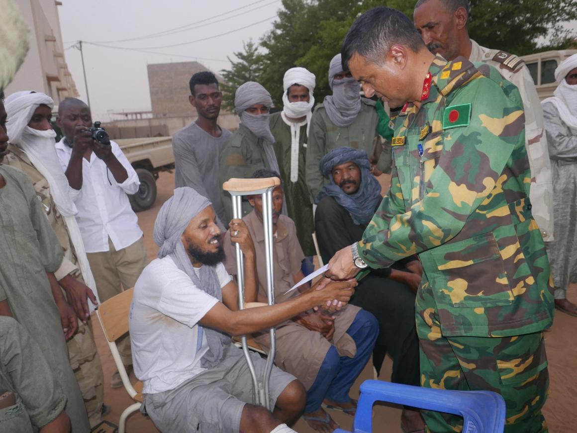Les bénéficiaires présents ont reçu chacun une enveloppe et une partie du don a été remise au Coordinateur du MOC, le Colonel Ag Rhissa. Les médicaments ont été remis par le médecin du bureau régional de la MINUSMA. « Je remercie la MINUSMA pour ce geste qui nous va droit au cœur. J’en profite pour inviter les autres donateurs à venir en aide aux victimes qui sont encore malades », a lancé le Coordinateur du MOC, le Colonel Ag Rhissa.