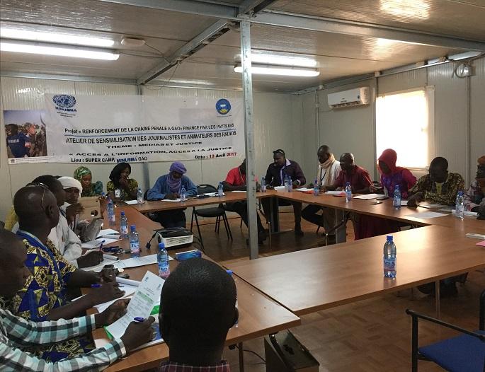 La Section des Affaires judiciaires et pénitentiaires (SAPJ) de la MINUSMA, en collaboration avec l’Union des radiodiffusions et télévisions libres (URTEL) du Mali, a sensibilisé, le 19 avril 2017, une vingtaine de journalistes et animateurs sur leur rôle dans l’accès des populations à l’information et à la justice. Cet atelier s’inscrit dans le cadre du projet de «Renforcement de la chaîne pénale à Gao», financé par le Royaume des Pays-Bas à travers le Fonds fiduciaire des Nations Unies en appui à la paix et à la sécurité au Mali.
