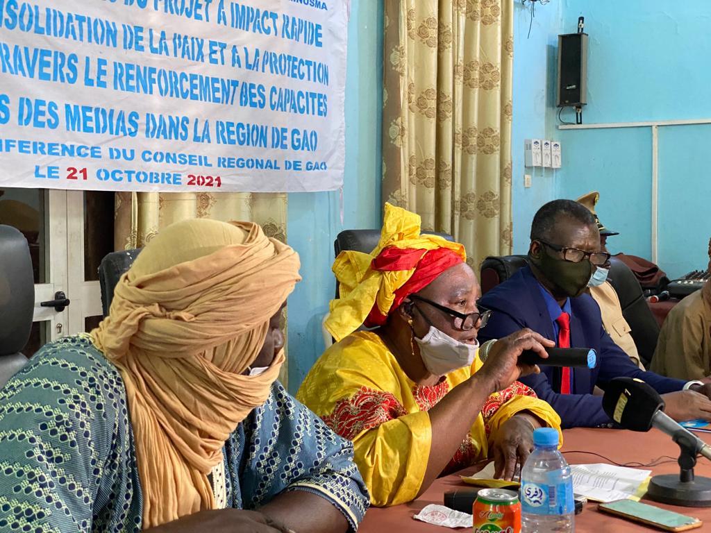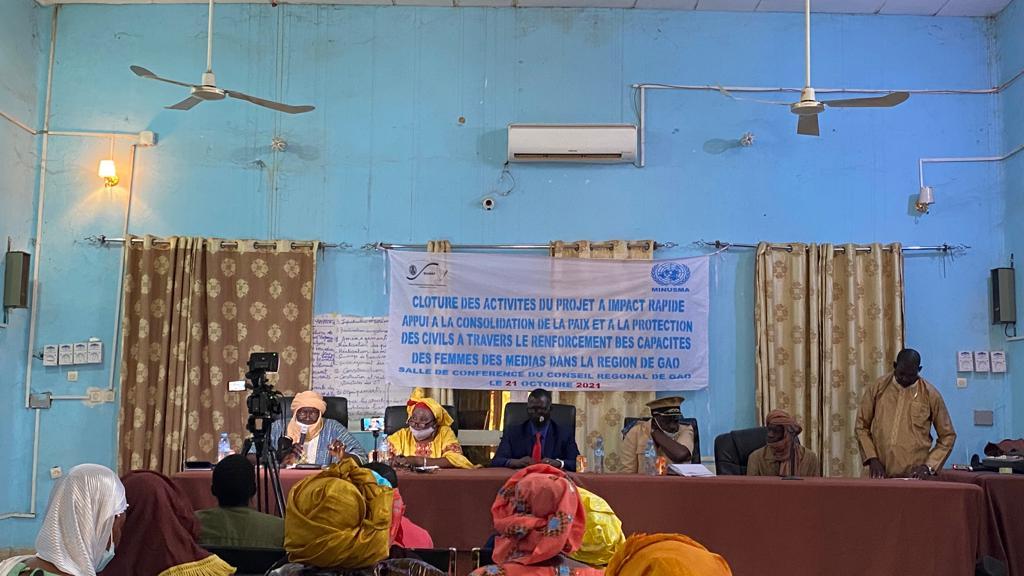 Le 21 octobre dernier, dans la salle du Conseil régional de Gao, en présence du Sous-Préfet de Gao et du représentant du Chef de Bureau de la MINUSMA, s’est tenue la cérémonie officielle de clôture du Projet à Impact Rapide « Appui à la consolidation de la paix et à la protection des civils à travers le renforcement des capacités des femmes des médias de la région de Gao ». Conçu et mis en œuvre par le Réseau des Femmes des Ateliers des Médias du Nord pour la Paix, avec l’appui technique et financier du bureau régional de la MINUSMA, ce projet a impliqué la formation de 45 femmes journalistes issues de 24 radios de proximité des cercles de Gao, Ansongo et Bourem. Portant sur les techniques d’animation et d’information radio, cette formation avait débuté le 15 juin dernier.