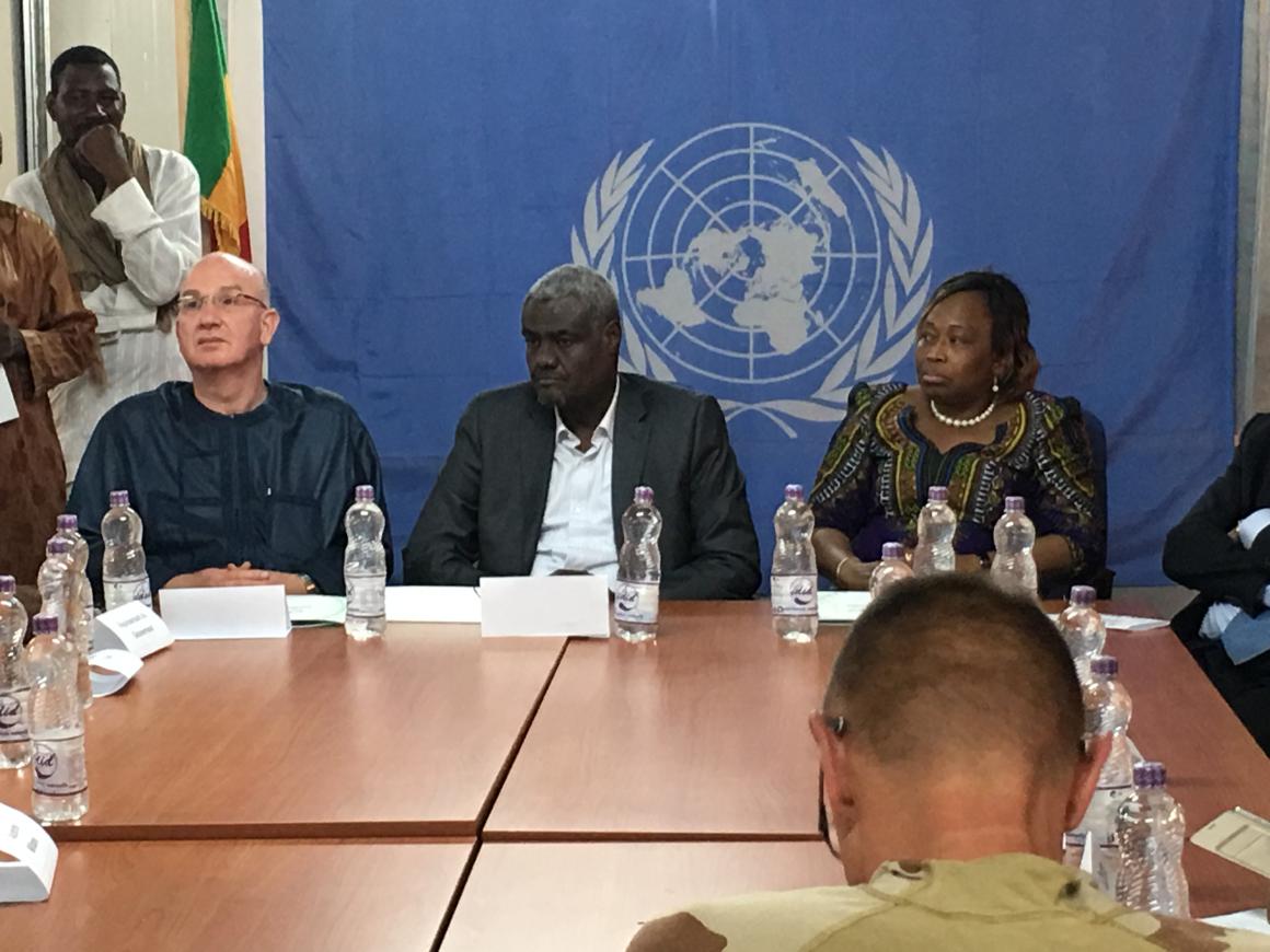 Le Président de la Commission de l’Union africaine (UA), M. Moussa Faki Mahamat, accompagné de M. Pierre Buyoya, Haut représentant de l’Union Africaine pour le Mali et le Sahel s’est rendu le jeudi 8 juin 2017, dans la région de Gao, où il a rencontré les représentants des forces internationales, notamment l’opération française Barkhane et la MINUSMA, des Forces de défense et de sécurité maliennes, du Mécanisme Opérationnel de Coordination (MOC), de la société civile et ceux de la jeunesse.