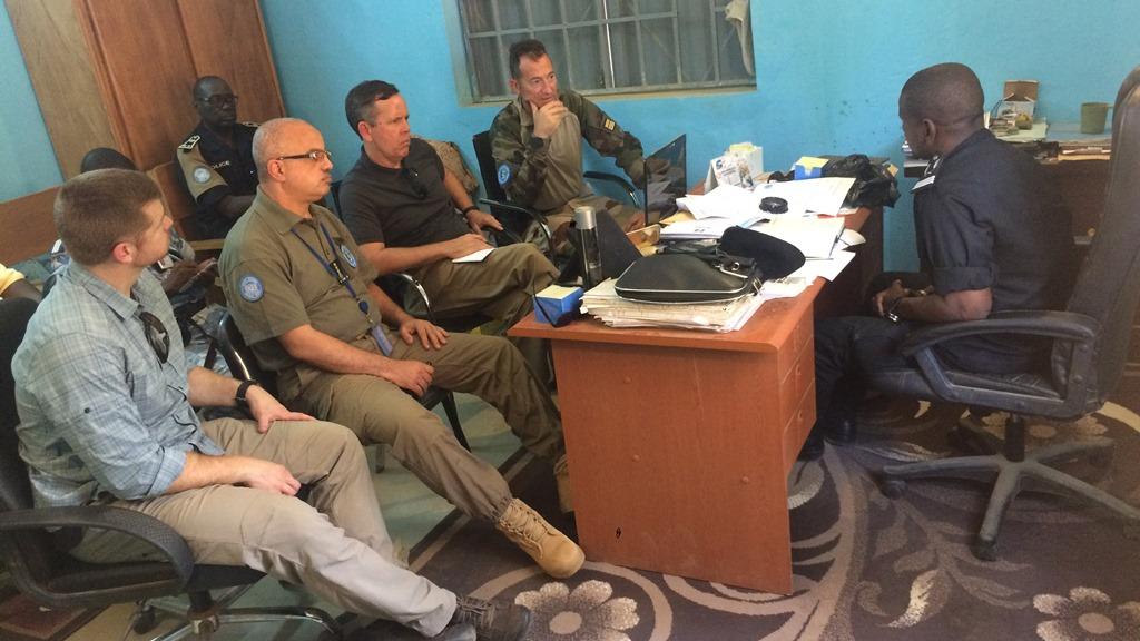 Du gouvernorat, la délégation s’est rendue au Commissariat Central de Police de la ville de Gao où elle a rencontré le Commissaire Principal Mody Tounkara. Les discussions ont surtout porté sur l’impact des projets à effet rapide et des formations que la MINUSMA a mis à la disposition de la police régionale. Le Commissaire Principal, installé dans son bureau réhabilité et rééquipé entièrement par la MINUSMA, a réitéré toute sa gratitude à la Mission. « Ces nouveaux locaux ont beaucoup amélioré nos conditions de travail qui s’amélioreront davantage une fois la réhabilitation du bâtiment de la Direction Régionale qui est en cours sera finalisée. Avec le matériel informatique et les différentes formations que nous avons reçu de la MINUSMA, le résultat est encore meilleur. Nous avons également reçu une dernière formation sur les gestes et techniques d’interpellation dispensée par nos amis de la Police des Nations Unie. J’avoue que nos hommes ont vraiment apprécié ladite formation qui va apporter beaucoup d’amélioration dans l’exercice de leur fonction. Je n’oublierai pas les patrouilles de routine que nous faisons de jour comme de nuit avec la MINUSMA. La collaboration est parfaite et nous ne pouvons que remercier nos confrères des Nations Unies » a déclaré le Commissaire principal du seul Commissariat de Police de la région de Gao.