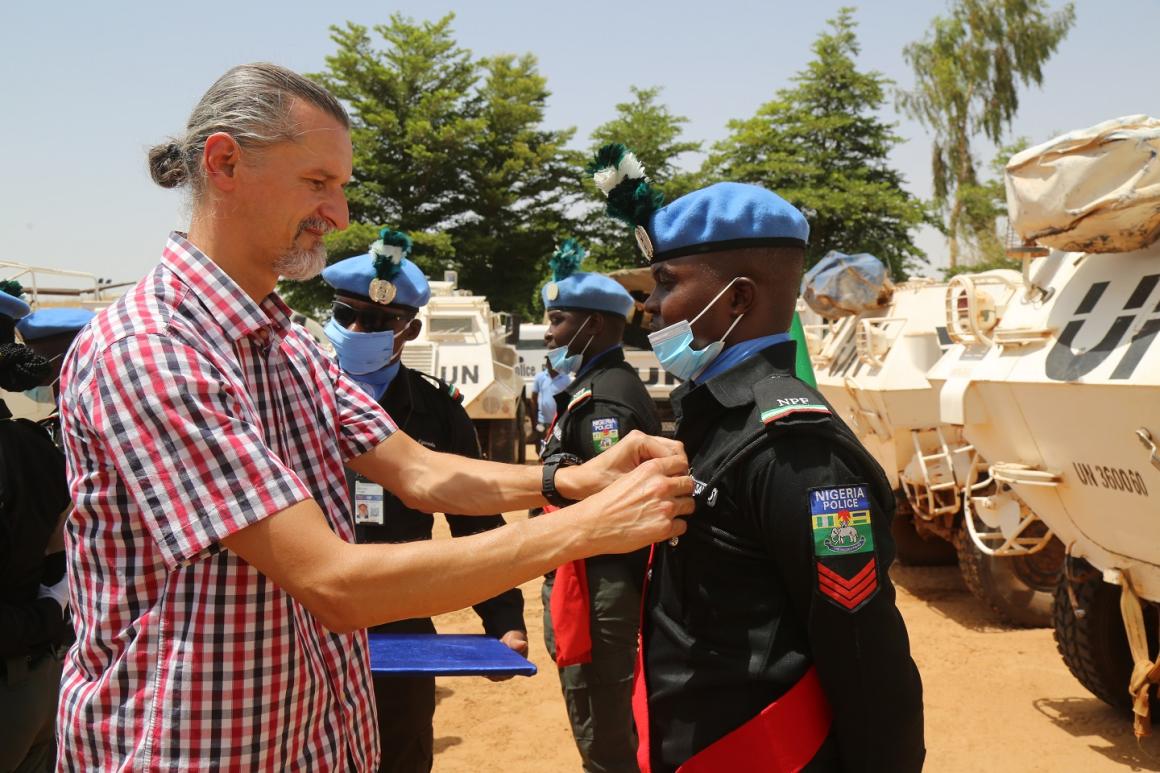 Avant la remise des médailles Sanou DIOUF a félicité les 140 récipiendaires de l’unité de police constituée du Nigeria dont 36 femmes. 27 autres officiers de police individuels venant du Benin, du Burkina Faso, du Cameroun, de la Cote d’Ivoire, de la France, de la Gambie, de la Guinée, du Niger, du Portugal, du Sénégal et du Togo faisaient également partie des récipiendaires. Sanou DIOUF les a appelés à continuer le travail avec honneur et a par ailleurs tenu à remercier les FSM, pour leur présence, en reconnaissance du travail effectué par la composante Police, tout en les exhortant au redoublement d’efforts dans les missions de tous les jours et en reconnaissance aux liens séculaires unissant le Gouvernement du Mali aux valeurs et symboles des Nations Unies.