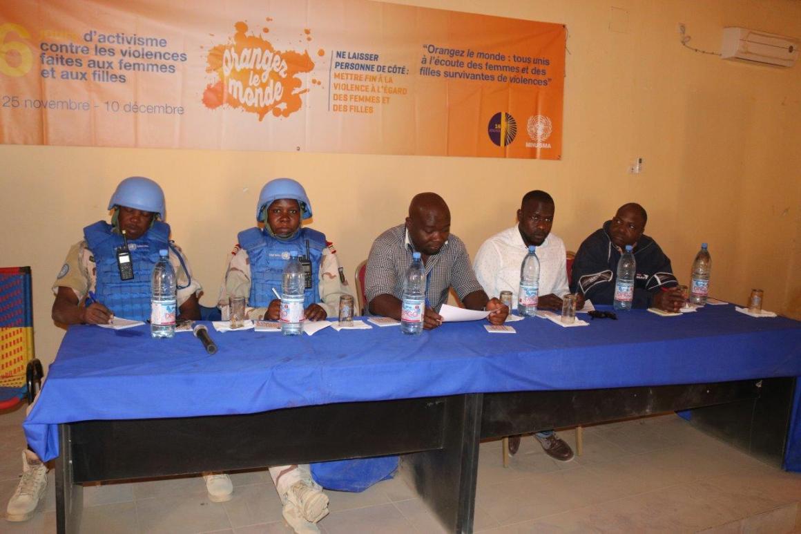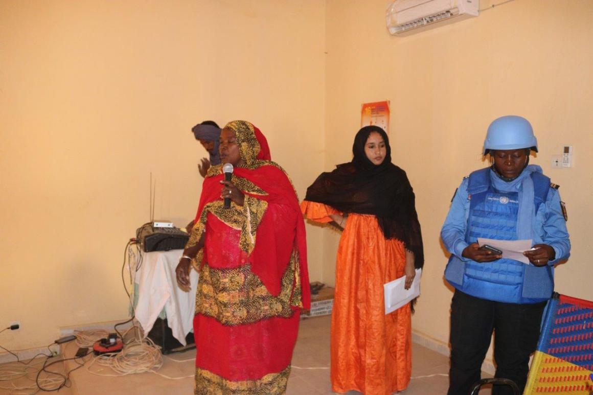 L’objectif de cette rencontre à laquelle ont pris part une soixantaine de femmes était de les sensibiliser pour prévenir et éliminer toutes les formes de violences basées sur le genre. « Nous sommes venus vous accompagner et vous encourager à participer à la vie publique. Il est aussi de votre droit de vous impliquer dans toutes les décisions qui vous concernent, » a déclaré à l’endroit des femmes, Pascal Langeblé de la section des Droits de l’Homme du bureau régional de Kidal. Il leur a aussi expliqué le concept des 16 jours d’activisme contre les violences basées sur le genre. Une campagne mondiale de lutte contre les violences faites aux femmes et aux filles, qui se tient entre les mois de novembre et décembre de chaque année. La Commandante Mbaye Mouminatou, point focal genre de la Force du secteur Nord, a, elle aussi saisi l’occasion pour souligner que « la femme joue un rôle très important pour la société. C’est pour cette raison qu’il faut la protéger. Notre souhait est que toutes les femmes s’épanouissent ». La commandant Mbaye Mouminatou a aussi assuré les femmes de Kidal du soutien de la MINUSMA, avant de les appeler à scolariser leurs enfants. Le même discours a été tenu par la Capitaine Apolline Traoré de la Police des Nations Unies (UNPOL/MINUSMA). « Les femmes et les enfants sont les plus grandes victimes en temps de conflits. C’est pourquoi il faut que les femmes se battent pour le retour de la paix, » a affirmé Apolline Traoré. Elle a aussi encouragé les femmes à dénoncer mais aussi à se confier sur les violences basées sur le genre dont elles sont victimes.