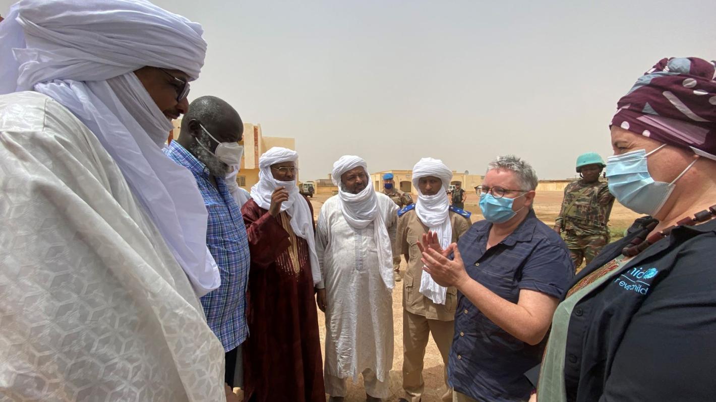Du 10 au 12 août 2021, Joanne ADAMSON, Représentante spéciale adjointe du Secrétaire général des Nations Unies au Mali, et Sylvie FOUET, Représentante résidente de l’UNICEF, ont effectué une visite à Kidal. Au cours de cette mission, Elles ont eu une série d’échanges avec les autorités administratives, les représentants de la société civile ainsi que ceux de la Coordination des mouvements de l’Azawad (CMA), sur l’état de mise en œuvre de son plan d’action pour lutter contre les violations graves faites aux enfants.