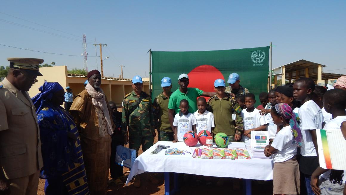 Avant la fin de la célébration, les contingents bangladeshi et cambodgien de la MINUSMA, ainsi que la Police onusienne/UNPOL ont offert des kits de fournitures scolaires aux enfants par le truchement de l’Académie d’Enseignement qui y était représentée par son Directeur, M. Sidi Oumar Touré.