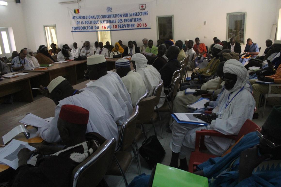 L’atelier visait à engager des concertations entre les différents acteurs concernés et impliqués dans la gestion des questions d’intérêt commun en matière de frontières. Il a réuni 73 participants au Conseil régional de Tombouctou, provenant des 5 cercles de la région de Tombouctou parmi lesquels des représentants de la société civile, des autorités locales, politiques, administratives, les partenaires au développement, techniques et financiers.