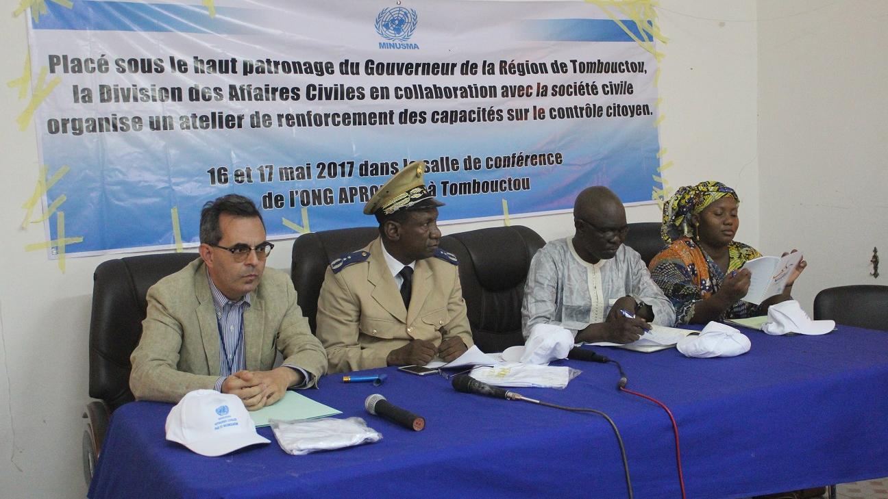 Un atelier de renforcement des capacités de la société civile de Tombouctou en matière de contrôle citoyen de l’action publique les 17 et 18 mai 2017. Organisé par la Section des Affaires Civiles de la MINUSMA, en partenariat avec le Forum des organisations de la société civile, cette activité est l’une des nombreuses actions de la Mission onusienne pour améliorer la participation de la société civiles dans la gestion locale des communautés. Ceci, à travers l’élaboration des politiques locales, l’exécution des projets locaux et le suivi évaluation des planifications, programmes et projets communautaires.
