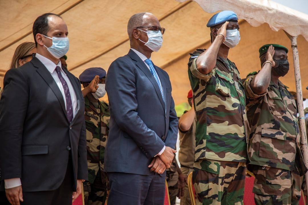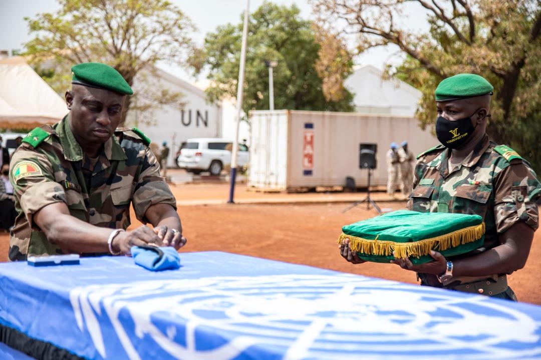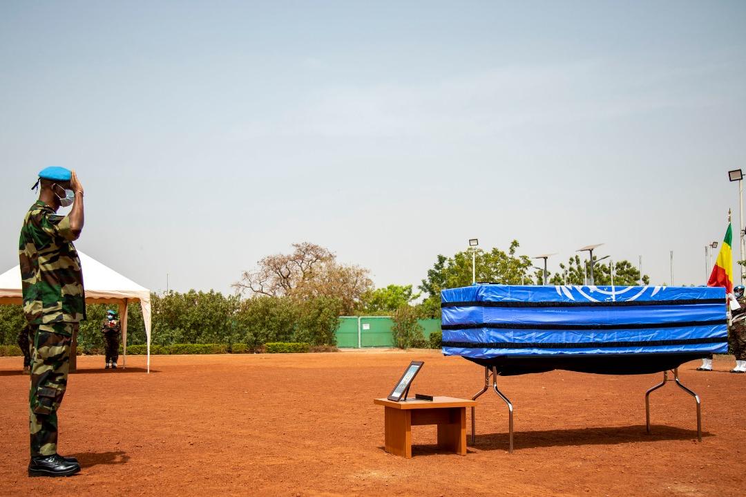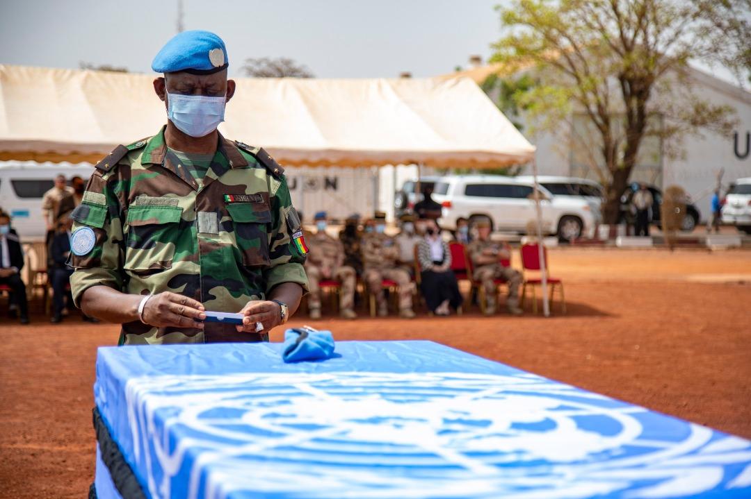 Décrivant une atmosphère « empreinte d'émotion et de tristesse », le Général Paul NDIAYE, Commandant adjoint de la Force de la MINUSMA, a rappelé à l’assistance qu’« il y a une semaine, jour pour jour, nous étions réunis pour rendre notre dernier hommage mérité à deux frères d'armes tombés au champ d'honneur le lundi 07 mars, à la suite d'un lâche attentat contre un engin piégé ». Pour le Commandant adjoint de la force, « cette lourde perte démontre une fois de plus la dangerosité de ce théâtre dont l'environnement est aussi hostile qu'imprévisible. Cependant, insistera-t-il, cela ne peut guère nous arrêter dans notre quête perpétuelle de recherche et d'établissement définitif de la paix au Mali ».