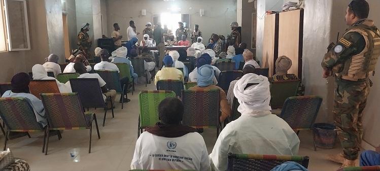 Cette prise de contact du juge avec les autorités, les notabilités, (chefs de villages, chefs religieux) et les représentants des jeunes et des femmes, a servi à informer les usagers sur la méthode de transmission de leurs requêtes à Tombouctou mais aussi, pour annoncer la tenue prochaine des audience foraines avec l’accompagnement de la MINUSMA, qui facilitera son déplacement et contribuera à sa sécurisation. Pour les autorités locales, cette visite laisse entrevoir une lueur d’espoir. « Nous sommes heureux d’accueillir la MINUSMA ainsi que le juge pour parler de nos problèmes et proposer des solutions qui pourront bénéficier à nos populations, »a déclaré Souleymane MAIGA, Premier adjoint au Maire de Rharous. De son côté, Abdoul Karim DIAMOUTENE est « comblé de venir rencontrer les autorités sur place et les communautés, pour parler de l’accès à la justice, même si elle n’est pas entièrement opérationnelle ». Le Juge de paix à compétence étendue de Gourma-Rharous s’est félicité de l’appui de la MINUSMA pour ce premier et pour celui qui sera accordé prochainement pour « la tenue d’audiences foraines pour répondre aux besoins de justice des populations ».