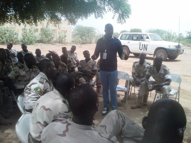 Dans le cadre de ses activités de promotion et de protection des droits de l’homme, la Division des droits de l’homme et de la protection (DDHP) de la MINUSMA , à travers son bureau Régional de Mopti, a organisé une campagne de sensibilisation sur la protection des droits de l’homme (DH) et du droit international humanitaire (DIH) du 3 au 10 mai 2017, au sein du Camp militaire des Forces Armées Maliennes Sevaré.