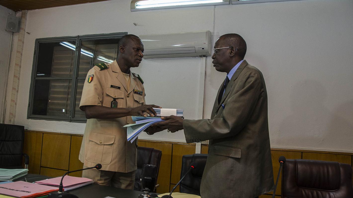 Attablés dans la grande salle de réunion du Ministère de la Défense et des Anciens Combattants, une vingtaine d’Officiers supérieurs de l’Armée malienne, à la tête desquels le Général Didier Dakouo, Chef D’Etat-Major Général Adjoint des Forces Armées, accueillent une délégation de la MINUSMA. En ce 28 avril, les FAMa ont convié le Directeur de la Section de la Réforme du Secteur de la Sécurité, M. Samba Tall, accompagné de quatre de ses collègues, à une cérémonie de remise de documents. Une cérémonie que les militaires maliens ont voulu modeste, mais d’une grande portée.