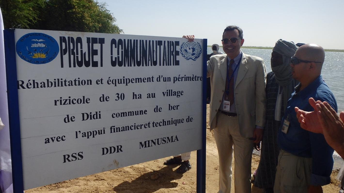 160 exploitants du périmètre rizicole de Didi, dont 60 femmes ont bénéficié, d’un projet communautaire financé à hauteur 52. 125 000 F CFA par le Bureau Régional de la MINUSMA à Tombouctou, à travers sa Section de la Réforme du Secteur de la Sécurité et du Désarmement Démobilisation et Réinsertion RSS-DDR et ce, en partenariat avec l’Association pour le Développement en Zone Aride (ADAZ). Cette action vise à renforcer les moyens de résilience des ménages vulnérables par la relance de la production rizicole, en vue d’acquérir des revenus et contribuer ainsi à la sécurité alimentaire et nutritionnelle durable des populations. Cette réalisation s’inscrit dans le cadre des projets de la Réduction de la Violence Communautaire (RVC). Le but visé étant de contribuer à l'amélioration de la sécurité et au renforcement de la cohésion sociale, à la promotion du dialogue et, à la réconciliation entre les différents membres de la communauté.