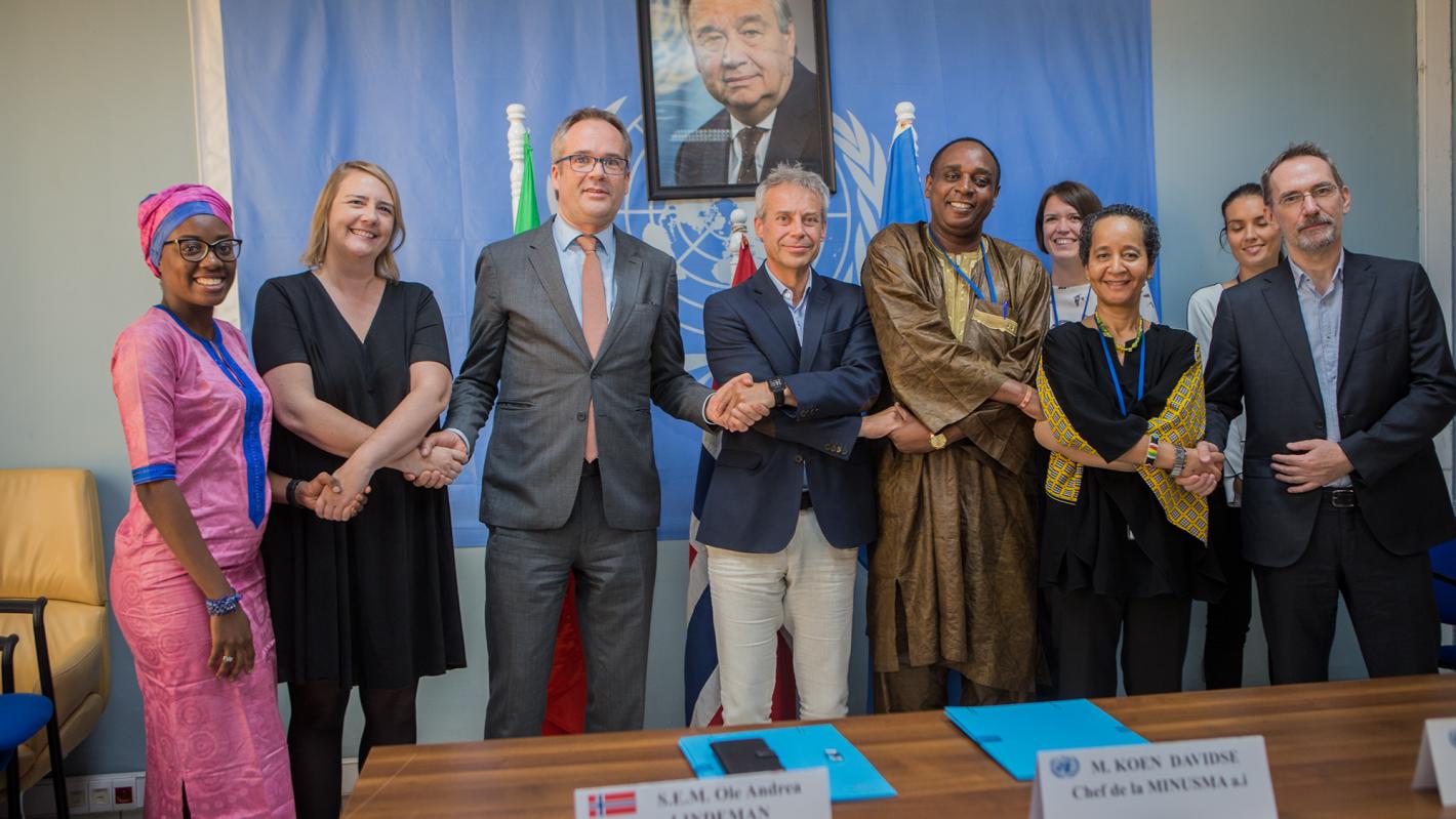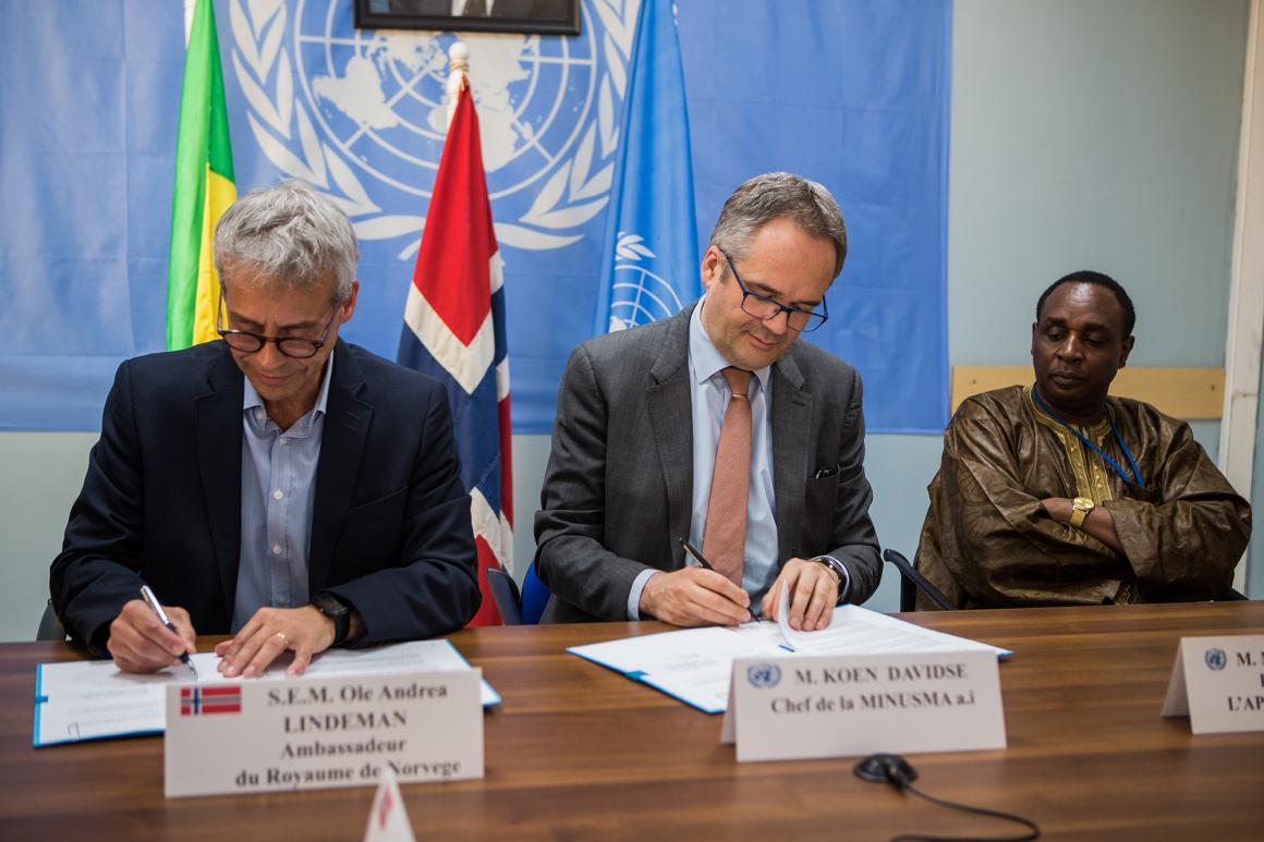 Le Représentant spécial adjoint du Secrétaire général des Nations Unies chargé des affaires politiques, M. Koen Davidse, a officiellement signé avec l’Ambassadeur de Norvège au Mali, M. Ole Andreas Lindeman, une convention de financement d’un montant d’environ 960 000 dollars américains au Fonds Fiduciaire, administré par la MINUSMA, en soutien à la paix et la sécurité au Mali.