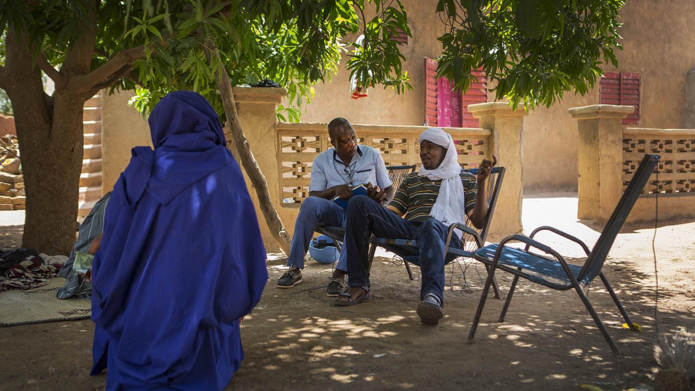 Pour éviter d’attirer l’attention sur les victimes, Abdouramane et Amadou se déplacent à pied jusqu’à une maison. « Nous ne venons pas avec une grosse équipe de sécurité et des militaires très visibles ; nous essayons d’être discrets dans notre approche, c’est important pour le respect et la sécurité de la famille, » explique Abdouramane.