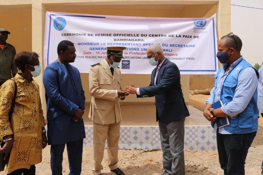 Le 16 juin dernier, El-Ghassim WANE, à la tête de sa délégation à laquelle s’est ajoutée le Chef de Bureau Régional du PNUD s’est rendu dans la nouvelle région de Bandiagara. Le Chef de la MINUSMA, a eu une première rencontre avec le préfet par intérim du cercle de Bandiagara, Abdoulaye TRAORE, représentant le Gouverneur. Le RSSG a ensuite inauguré la maison de la paix financée par le PNUD avant d’échanger avec les organisations de la société civile autour du plan d’action et du mandat de la MINUSMA. M. WANE les a encouragés à continuer leur engagement pour la paix tant recherchée. Après cette séance, M. WANE a également effectué la remise officielle de la maison des jeunes de Bandiagara et de la sous-préfecture de Sangha totalement financés par la MINUSMA.
