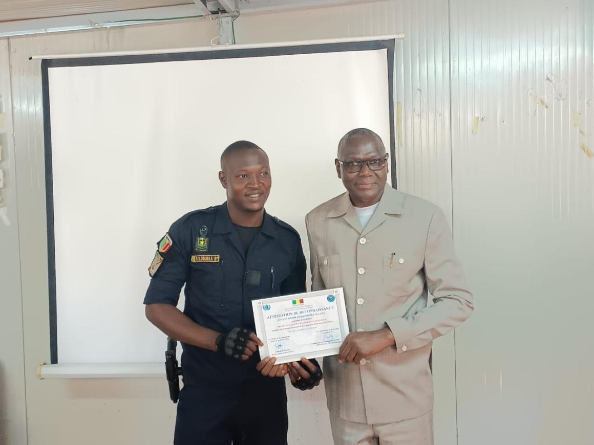 Une cérémonie symbolique à l’Ecole nationale de police à Bamako a officiellement mis fin à cette première session de formations, le 26 septembre 2022. Le Secrétaire général du ministère de la Sécurité et de la Protection civile, Oumar SOGOBA y a souligné la très haute importance du programme partenarial entre la cellule du ministère et la MINUSMA, ainsi que la valeur et l'engagement de ces agents de protection.