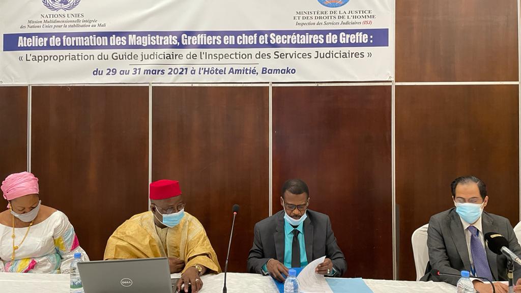 Du 29 au 31 mars dernier, s’est tenu à Bamako un atelier/formation d’appropriation et d’échanges sur le Guide de l’Inspecteur des Services Judiciaires. Soutenu par la MINUSMA cet atelier visait à présenter aux participants ce guide qui explique les méthodes de contrôle des personnels, juridictions et services associés du Ministère de la justice et des droits de l’homme par les inspecteurs de l’Inspection des Services Judicaires (ISJ).