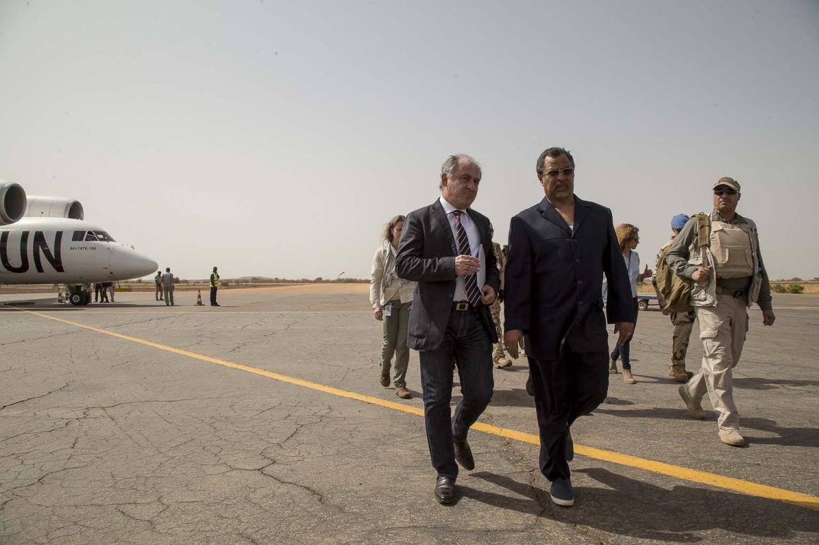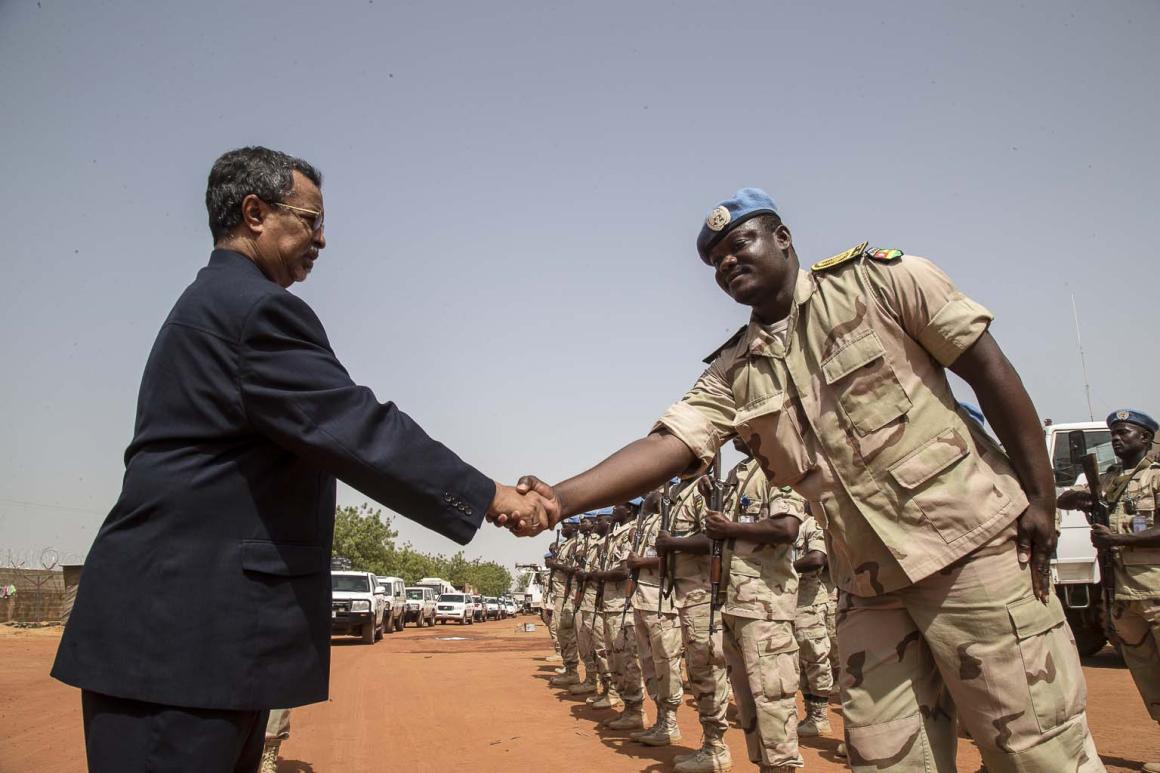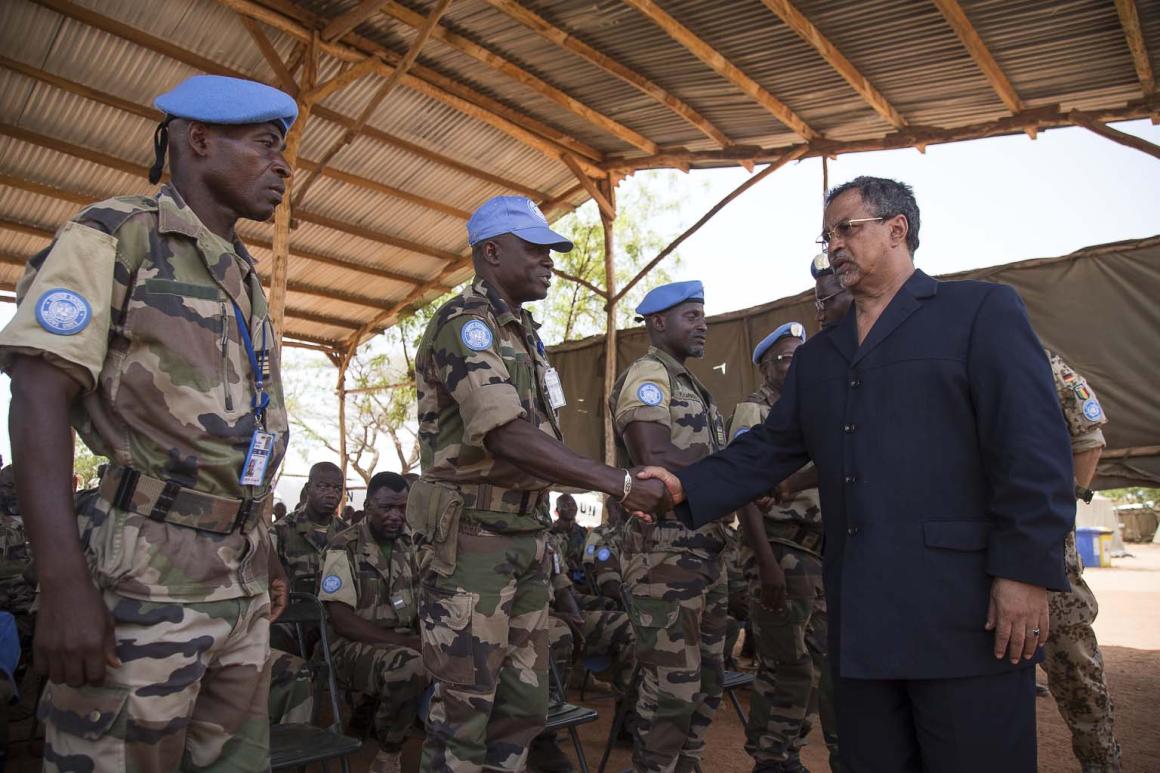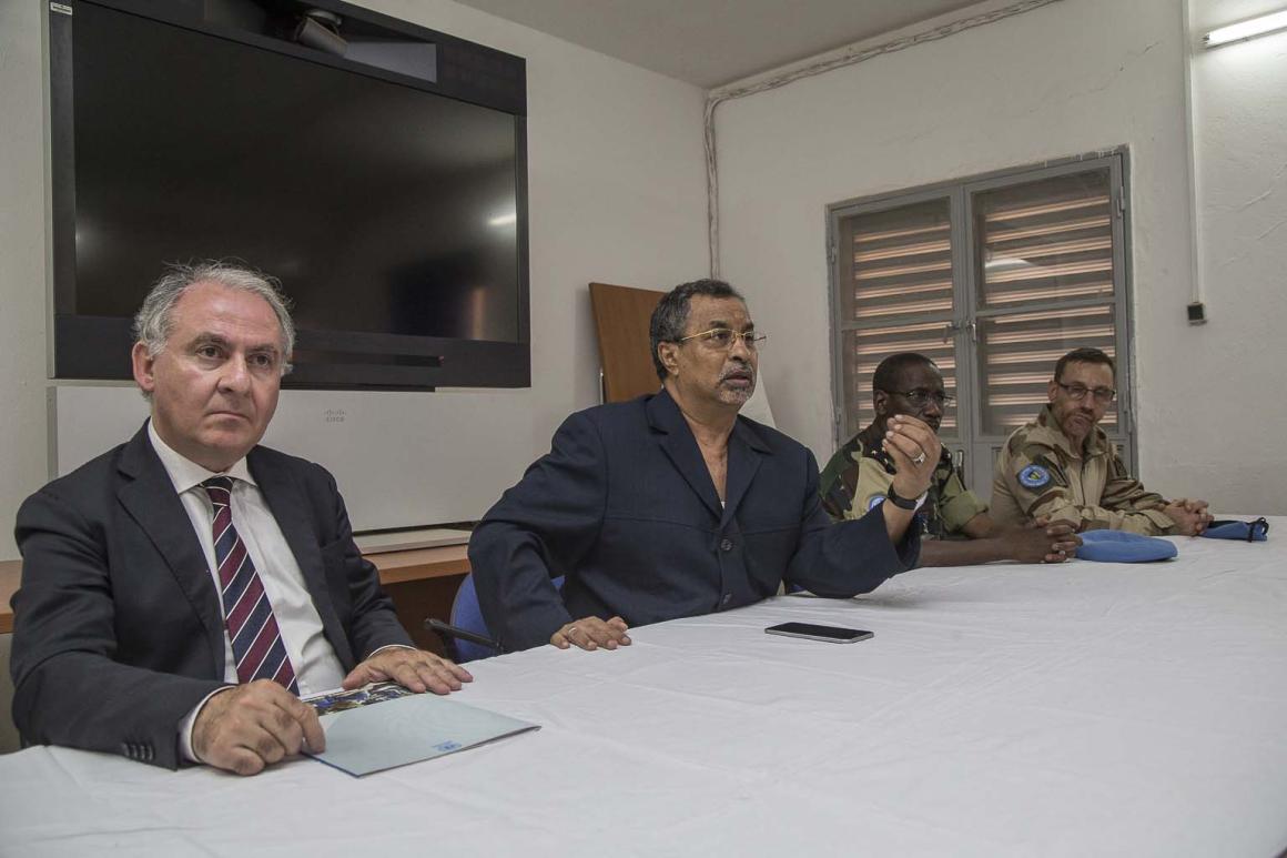 Suite à l’attaque survenue dimanche 29 mai dernier contre des Casques bleus de la MINUSMA, à quelques kilomètres de Sévaré (région de Mopti), ce mercredi 1er juin, une délégation de responsables de la Mission, conduite par son Chef, Monsieur Mahamat Saleh Annadif, a effectué une visite au camp de la Mission à Mopti. Monsieur Annadif est venu témoigner de sa solidarité avec le contingent victime de cette attaque et le personnel de l’ONU sur place, mais aussi réaffirmer la détermination de l’Organisation à poursuivre son mandat au Mali. Le Représentant Spécial du Secrétaire Général des Nations Unies était notamment accompagné du Commandant adjoint de la Force de la MINUSMA, le Général de Division Amadou Kane, du Colonel de Gendarmerie, Jean-Frédéric Sellier, Commissaire par intérim de la Police des Nations Unies UNPOL.