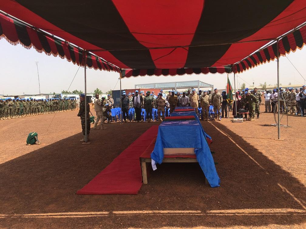Deux jours plutôt, soit le 25 septembre à Gao, se tenait un service funèbre célébré par le maître religieux Zakir Hossaen du 4ème contingent bangladais. Y ont assisté le commandant du même contingent, le Colonel Tariq, le Chef de Bureau par intérim de la Mission onusienne, Emile Bacop Tchaptile, des représentants de la 1ère région militaire, de la Force Barkhane et ceux du Mécanisme Opérationnel de Coordination (MOC). Le Commandant Régional de la Police onusienne (UNPOL), le Commandant adjoint du Secteur-Est de la MINUSMA et tous les commandants des différents contingents ont aussi rendu un dernier hommage à leurs camarades d’armes tués sur l’axe Anéfis-Gao.